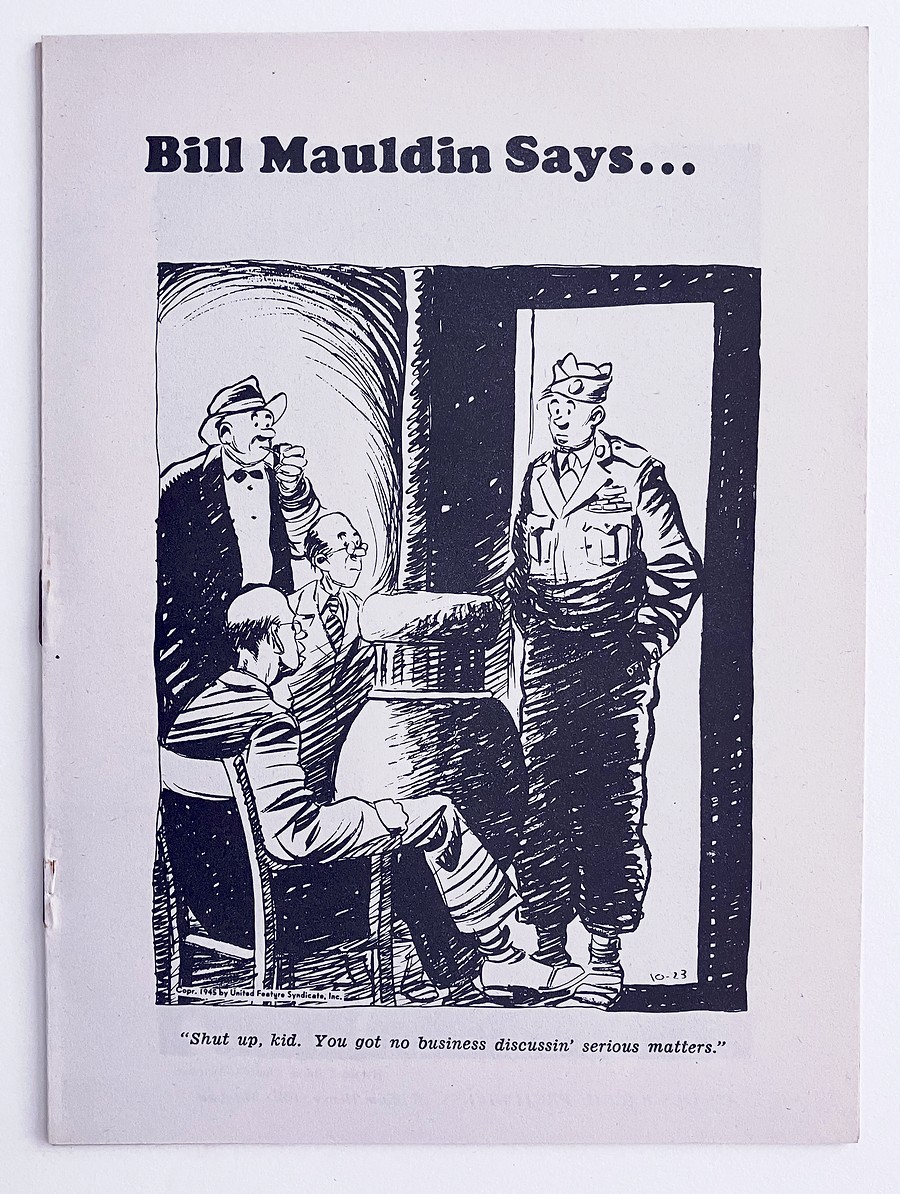 Bill Mauldin Says... by Bill Mauldin, Speech by William Henry (Bill) Mauldin as delivered at the New York Herald Times Forum on October 31, 1945, First Edition of the separate printing of the article by Mauldin that was originally printed in the New York Herald Tribune November 4, 1945, 5.5 by 7.5 inches, New York: The Writer's Board, 8 pages, in excellent, as new, condition. The full title of this publication is "Mauldin Says Bigotry at Home Mocks Sacrifices of Soldiers." The famous war cartoonist from Stars and Stripes stresses that the successes in World War II by African American, Jewish, and Japanese American soldiers failed to crush hate and intolerance toward African Americans, Jews, and Japanese Americans among the white American Christian population in the United States. He speaks out against intolerance and closes his speech with the note that he is an American citizen, a gentile, a Christian, and his skin is white; he also says that he is not a Communist (in response to the post- war Communist scare by right wing politicians that led to Senator Joe McCarthy). So he is "very curious to see what sort of criticism I am going to get from this." In addition to the text are the cartoon on the front cover and two additional Willie and Joe cartoons attacking intolerance. This is an extremely scarce publication, especially in this fine condition. Mauldin was a man who spoke the truth before his time.