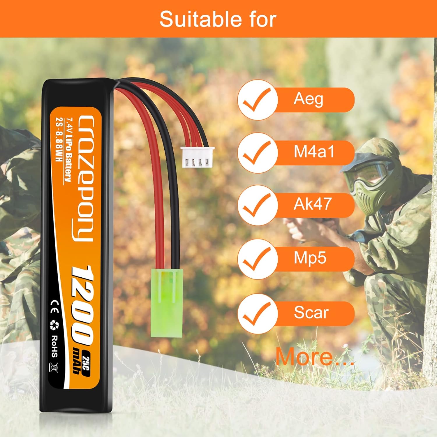 Equipped with Mini Tamiya connector, it will fit many other series and models like M4, AK47, MP5K, MP5, SCAR, M249, M60, G36, RPK, AUG. | Only use a LiPO Balance Charger for charging this battery.Do not use a NiMH battery charger to charge this battery.Do not over charger the Battery. | Discharge Rate: 25C Dimensions: 10.4 * 2 * 1.1 cm Weight: 48g |