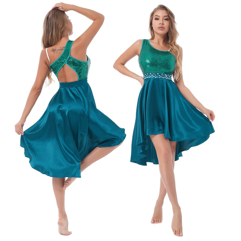 Women Rhinestone Figure Skating Dress See-through Mesh Patchwork Ruffle Skirted Leotard.