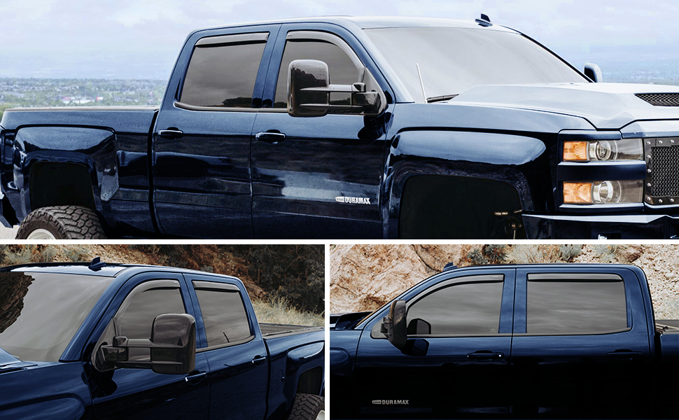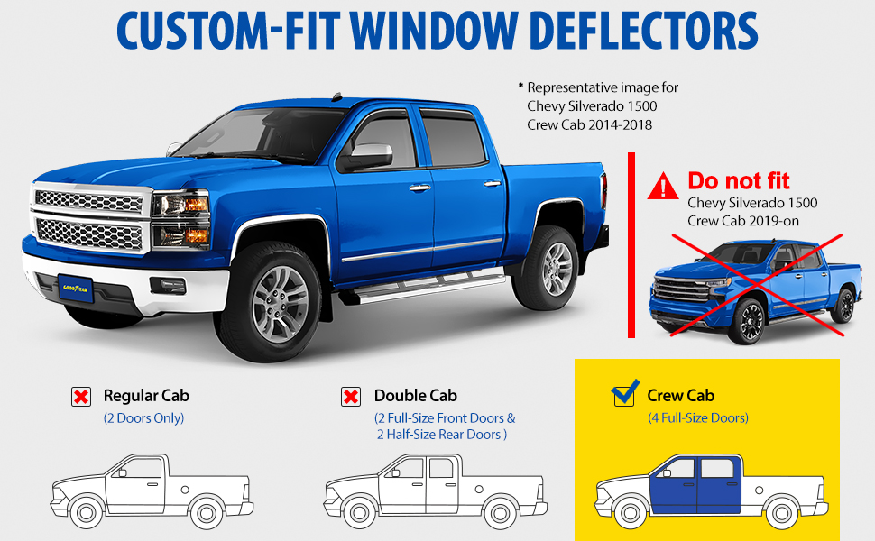 - Attention! Vent deflectors CUSTOM FIT only for Chevrolet (Chevy) 2014-2018 Silverado 1500 Crew Cab, Silverado 2500 2015-2018 Crew Cab, Silverado 2500 HD, 3500 HD 2015-2019 Crew Cab, GMC Sierra 1500 2014-2018 Crew Cab, Sierra 2500 HD, 3500 HD 2015-2019 Crew Cab.