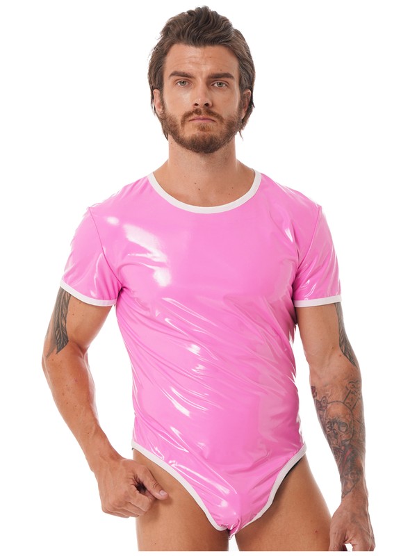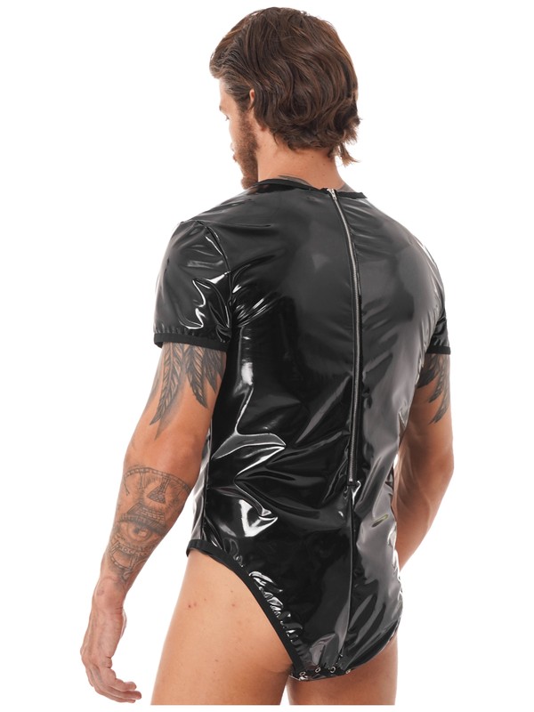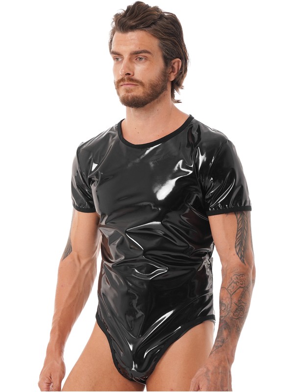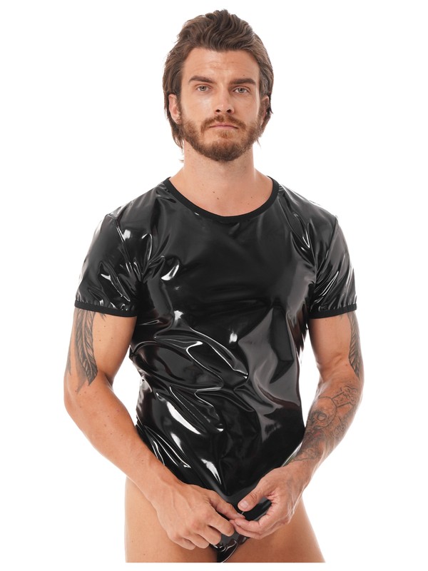 Herren Wet Look Lackleder Kurzarm Body Rundhals Reißverschluss Trikot Clubwear.