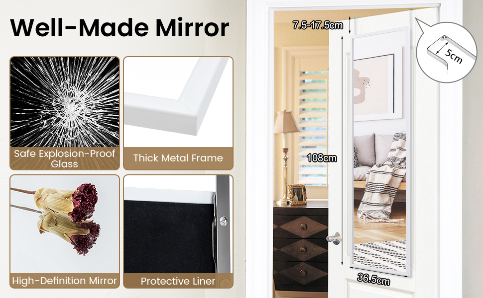 Unlike standing mirrors, our mirror can be placed behind the door or on the wall according to your preference. Super large size, it can fully illuminate your whole body, which is convenient for you to check your own clothes in all directions. And with the high-definition mirror, your beautiful image will not be distorted at all. No matter if you put it in your entrance, living room or cloakroom, there will be no sense of violation.