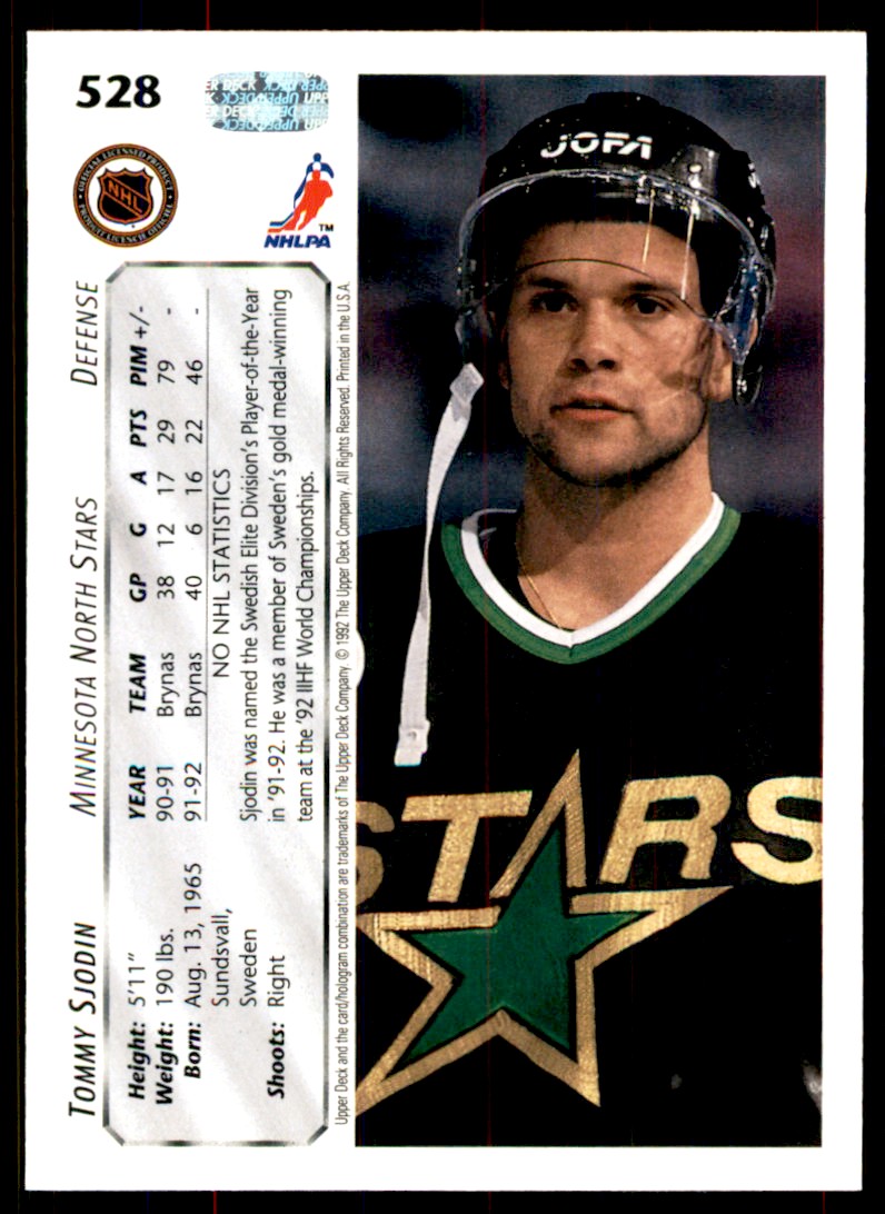 | Description: | Tommy Sjodin | | Category: | Hockey | | Year: | 1992 | | Product: | Upper Deck | | Team: | Minnesota North Stars | | Card Number: | 528 | | Rookie: | Yes | | Memorabilia: | . | | Special: | | | Dimensions: | 3½" x 2½" |