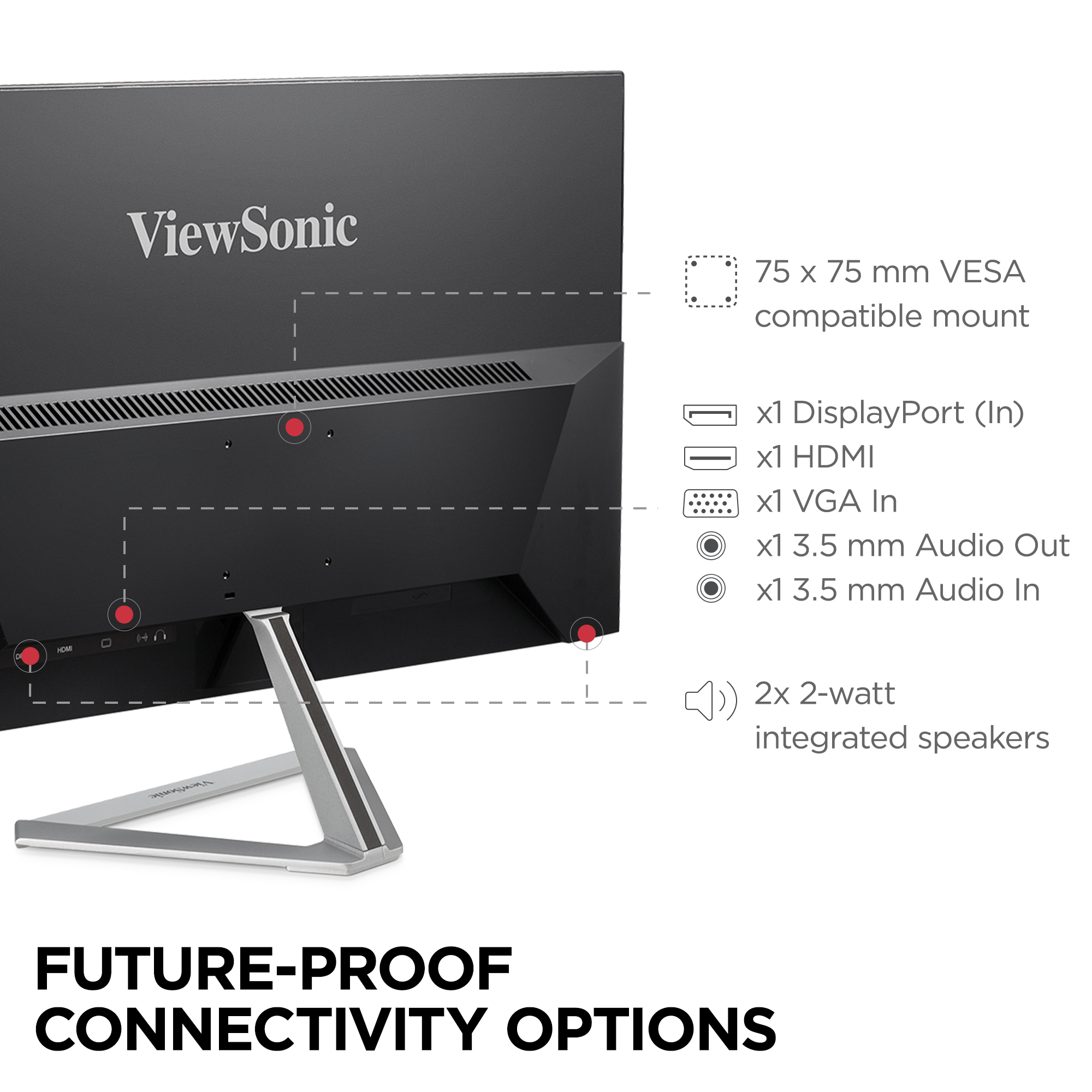Style and substance go hand-in-hand with the ViewSonic VX2476-smhd 24" (23.8 viewable area) Full HD monitor. SuperClear IPS panel technology, wide viewing angles, and best-in-class screen performance deliver outstanding visual clarity great for vibrant entertainment and gaming. A premium ID includes an ultra-slim profile, unique desktop stand, and a sleek edge-to-edge frameless screen, that when combined with vivid 1920x1080 resolution and dual speakers, deliver an immersive viewing experience for home entertainment and multimedia applications. Versatile HDMI, DisplayPort, and VGA inputs keep you connected to your favorite devices, while the modern, flush-mount frameless bezel design makes a standout statement in any home.