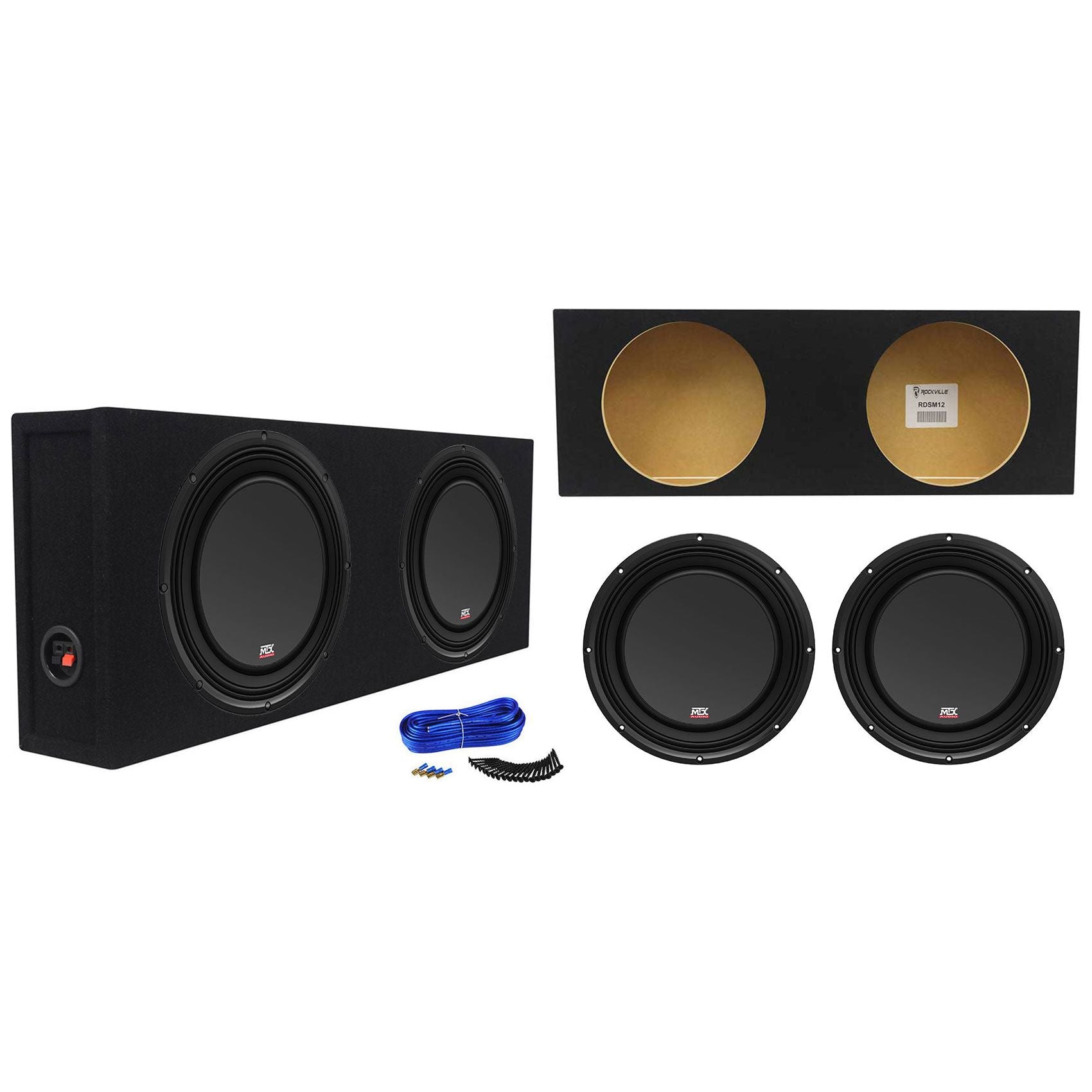 Package: (2) MTX 3510-04S 10" 1200 Watt Peak/600 Watt RMS 4-Ohm Car Subwoofer + Rockville RDSM10 Dual 10" 0.56 Cu. Ft. Sealed Shallow Mount Subwoofer Enclosure - Proudly Made In The USA With Grade "A" MDF Wood For The Best Sound and Performance From Your Subs! + Dual Sub Box Enclosure Installation Kit: Speaker Wire, Screws, Spade Terminals