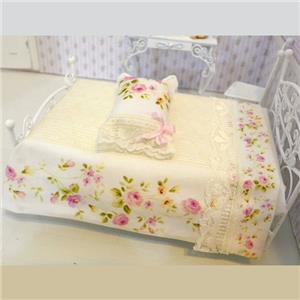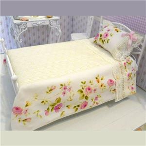 One miniature pillow & top sheet set made of color printed 'poplin' cotton, water resistant, but not washable. The bed frame is NOT included in the listing, it is for display purposes only.