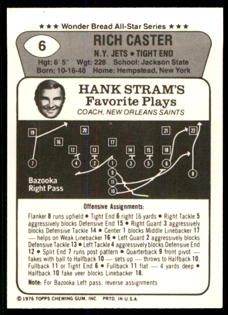 | Description: | Richard Caster | | Category: | Football | | Year: | 1976 | | Product: | Wonder Bread. | | Team: | New York Jets | | Card Number: | 6 | | Memorabilia: | . | | Special: | | | Dimensions: | 3½" x 2½" |