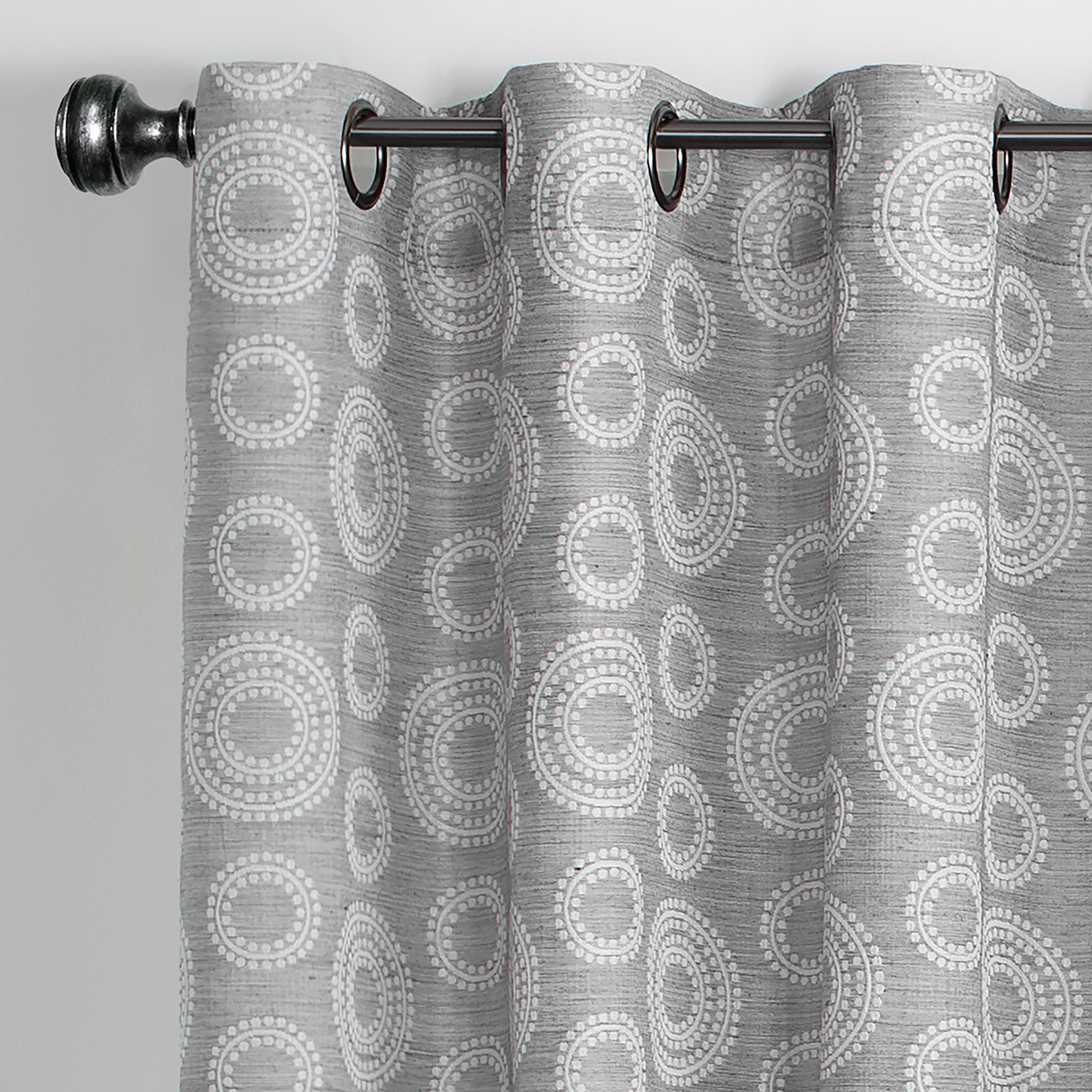This eclectic woven jacquard has a soft natural textured background & is highlighted with white accent alternating circles. This panel will add a spectacular look to any room. The 8 gunmetal grommets complete the look providing a natural cozy clean look.