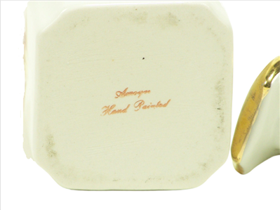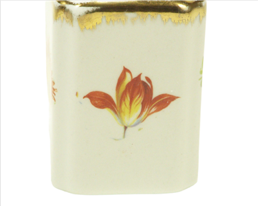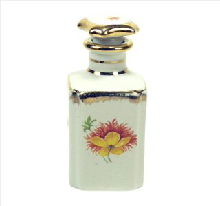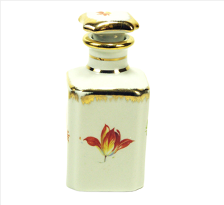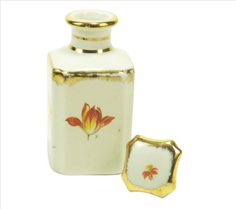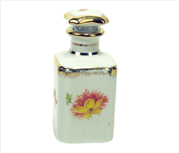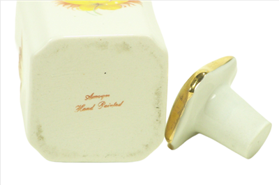 The floral decoration remains fresh and bright, however, the gold trim has wear and there are a few small paint smudges here and there. The bottle is free of chips, cracks, repairs and crazing. It measures approx. 5 1/8" high x 2 1/2" square. It is signed Limoges, Hand Painted.