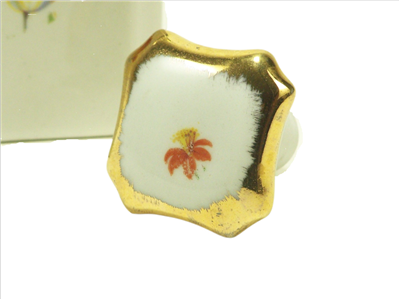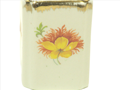 This vintage Limoges hand painted porcelain perfume bottle is decorated with yellow and orange flowers on an off-white background. The bottle has a square shape with 4 recessed corners and a matching stopper. It is trimmed in brushed gold.