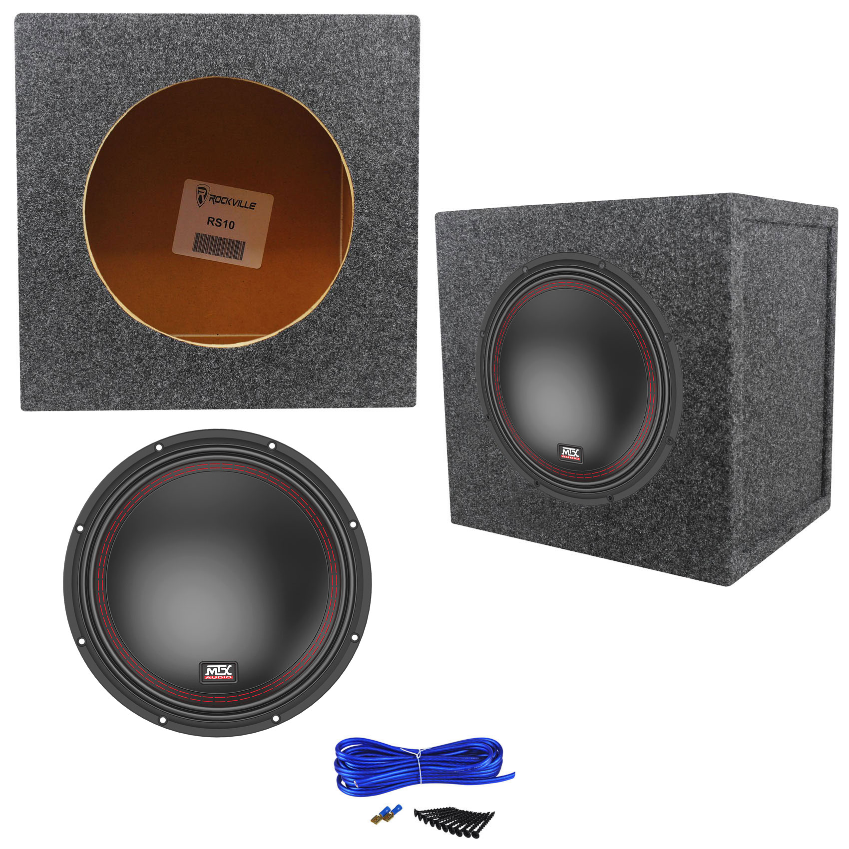 Package: MTX 5510-22 10" 800 Watt Peak/400 Watt RMS 2-Ohm Car Subwoofer + Rockville RS10 Single 10” 0.75 cu.ft. Sealed Subwoofer Enclosure With Grade A 3/4" MDF, Made in America Using Only the Highest Quality Materials for the Best Performance and Sound From Your Subs + COMPLETE SINGLE ENCLOSURE INSTALLATION KIT WITH 14 AWG SPEAKER WIRE + DRYWOOD SCREWS + SPADE TERMINALS