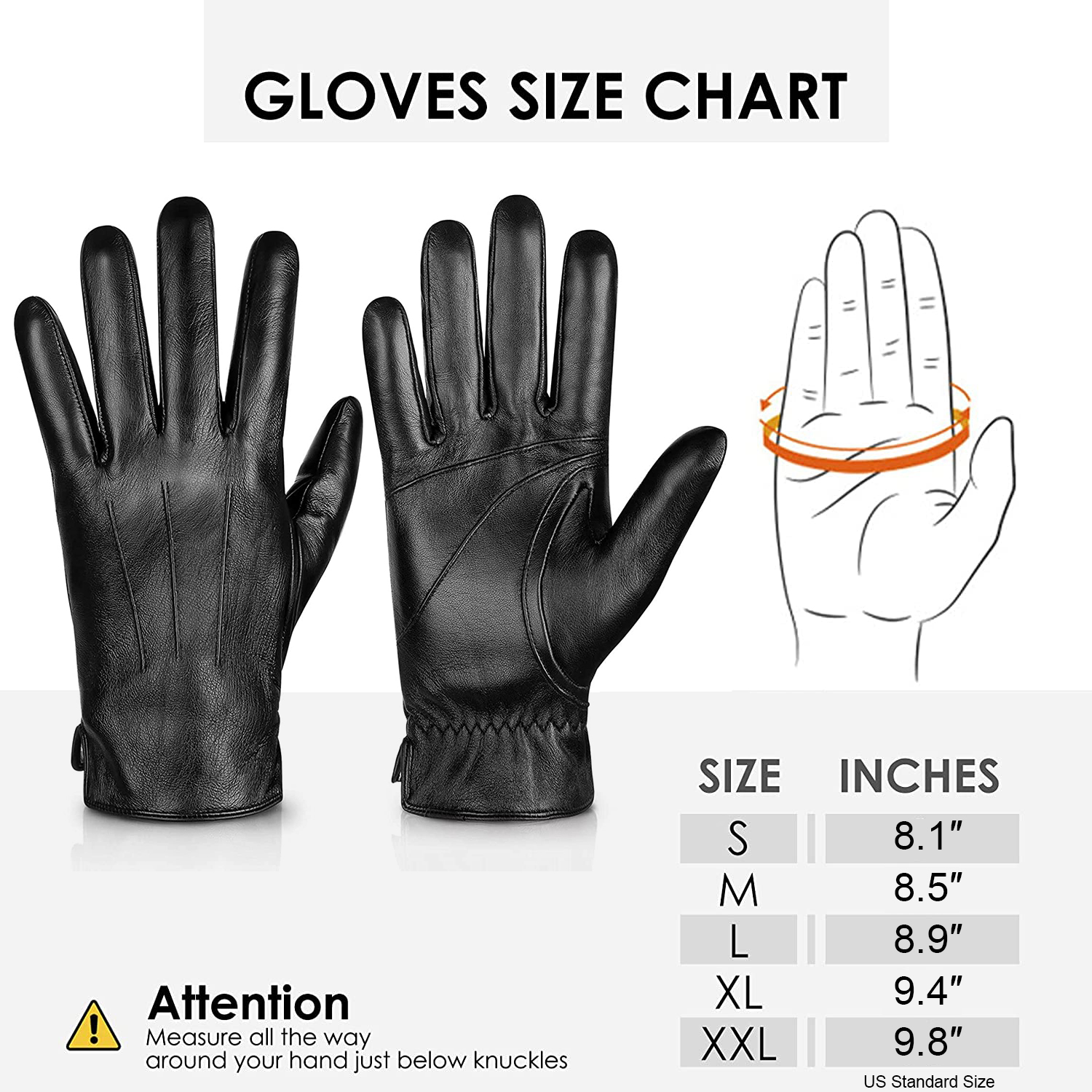 9 / L : Palm Girth: 9inch/23cm , Middle Finger Length: 3.66inch/ 9.3cm , Glove length: 10inch/25.5cm
