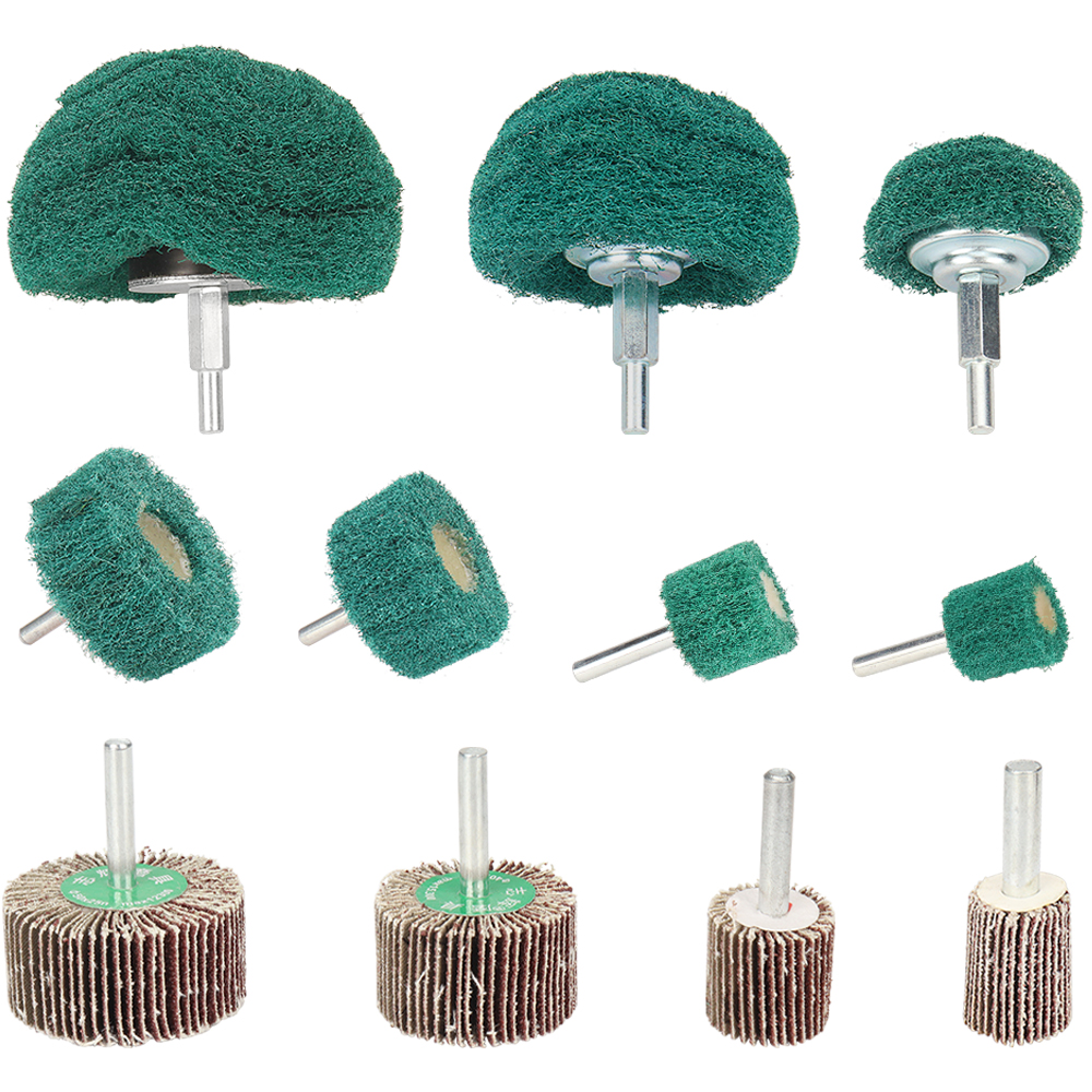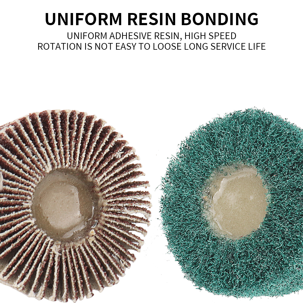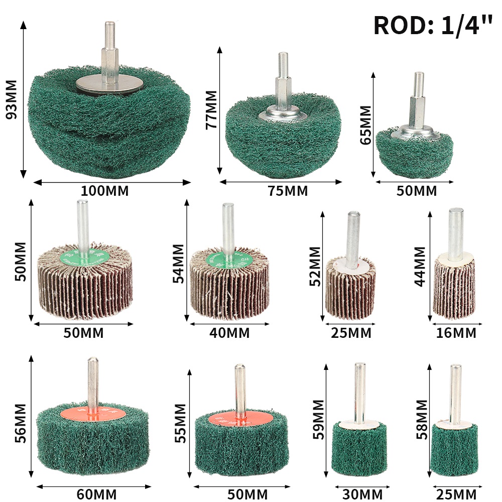 【PACKGUE INCLUDED】3pc mushroom head polishing pads (50mm/75mm/100mm), 4pcs cylindrical scouring pad polishing wheel (25mm/30mm/50mm/60mm), 4pcs flap wheel 60# (16mm/25mm/ 40mm/50mm) to meet different grinding needs.