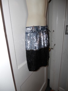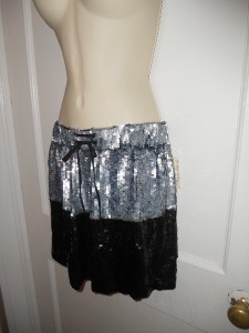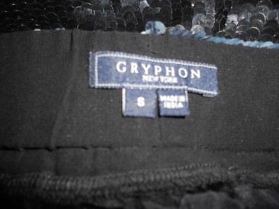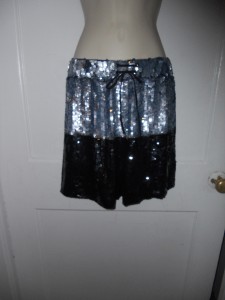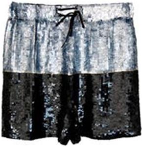 Gryphon Sequin Board Shorts. Silk and two-toned sequin board short with ocean-coloured sequins at top and black sequins at bottom with thin gold sequin stripe dividing the colour blocks. Elasticated waistband and black silk drawstring waist. 100% silk. Dry clean only.