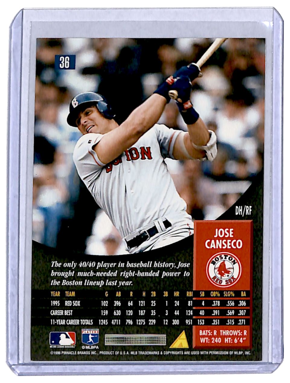 | Description: | Jose Canseco | | Category: | Baseball | | Year: | 1996 | | Product: | Pinnacle | | Team: | Boston Red Sox | | Card Number: | 36 | | Dimensions: | 4" x 3" |