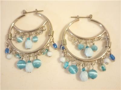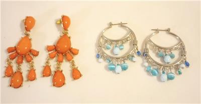 2 awesome pairs, both boho style. Love the almost 3" long dangles with orange plastic cabs set into gold toned metal. For a change of pace, wear the silver toned circles with blue beads, These are Avon. Not marked but I found them using Google Lens. There are faceted plastic beads and glass cat's eye, both in lovely shades of pale blue. Gorgeous! These are worth more than the low price I've set for this listing.