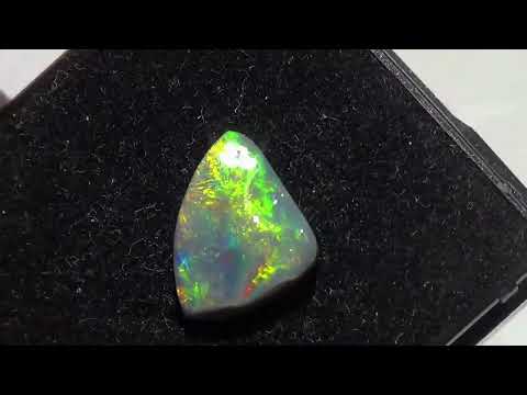 Solider GEM Farben Australischer S-Black Opal (GANZE 2,33 CARAT !) mit leuchtenden GOLD-ORANGE-ROT--Grün- Türkisen Pattern in sehr edler Form geschliffen. Black und Semiblack Opale sind die hochwertigsten Opale aus Lightning Ridge. Hochglanz Politur mit leicht natürlich gewölbter Oberfläche (Siehe Video) !! GEM KLASSE BRILLIANTES Farbspiel.