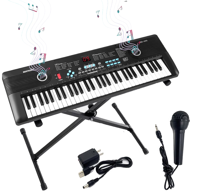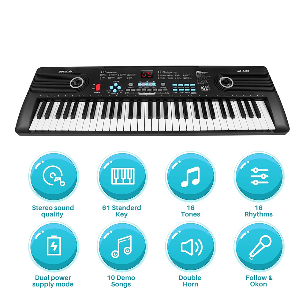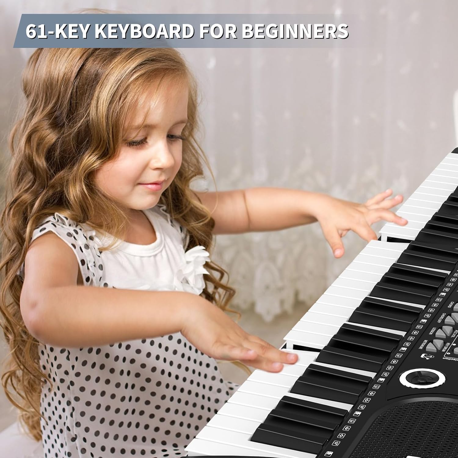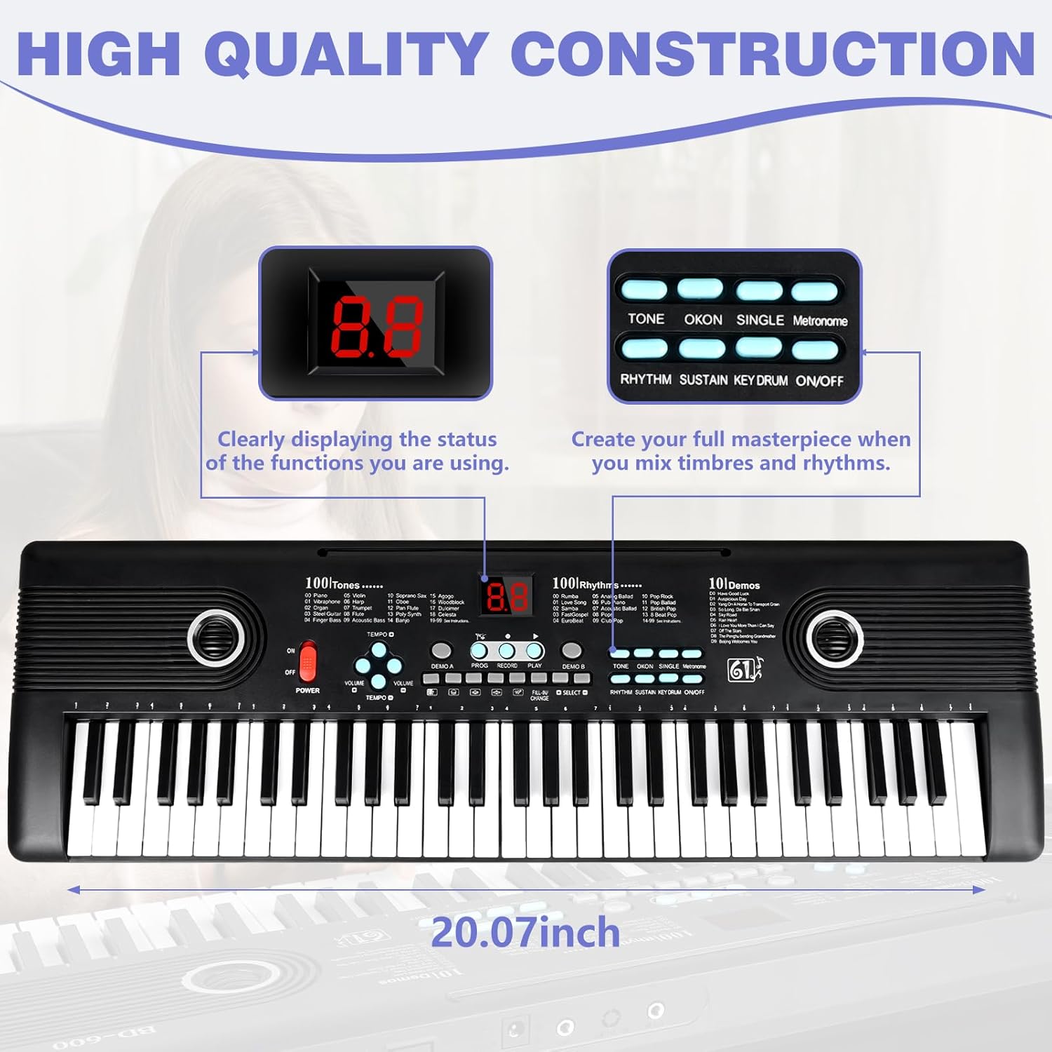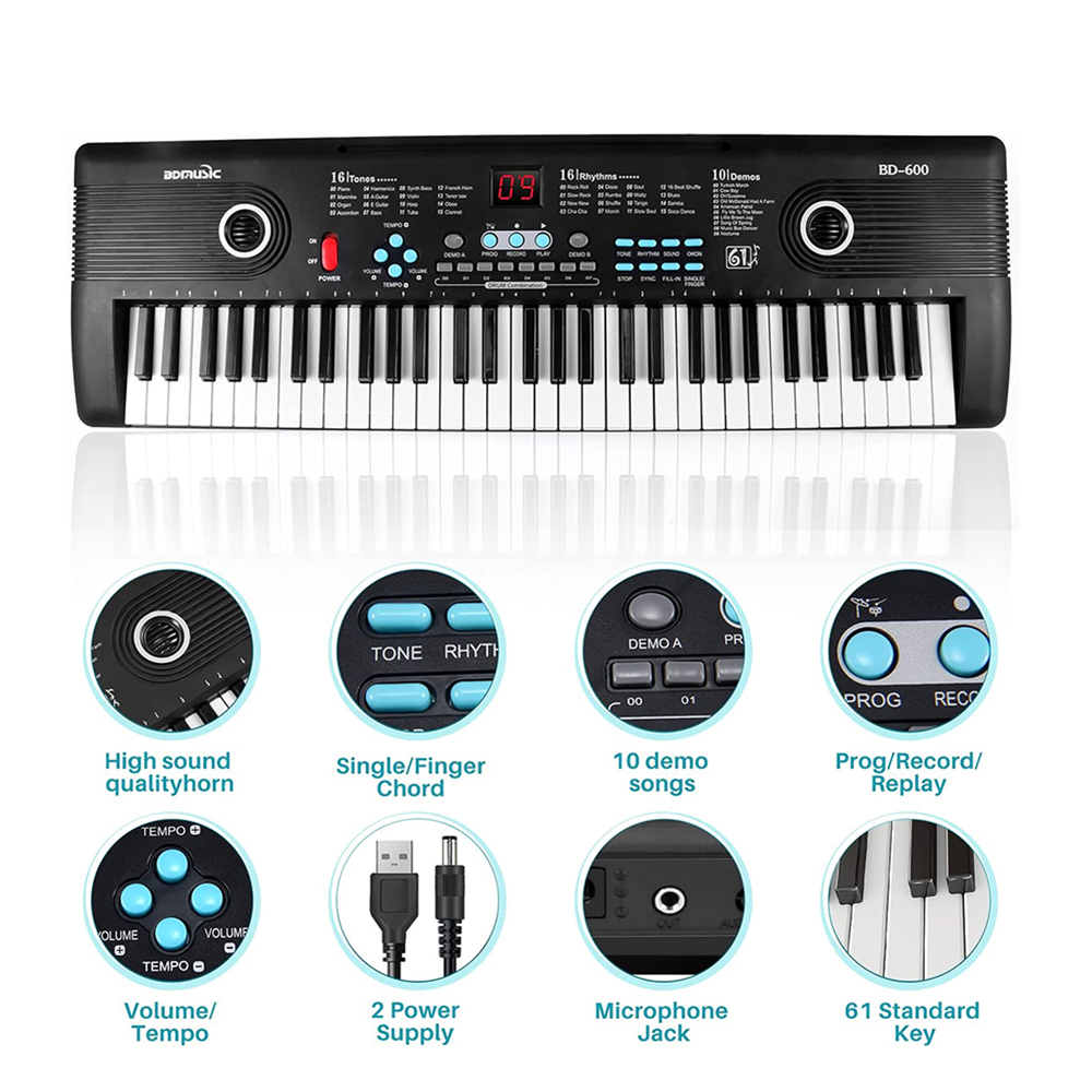 - 【Multifunctional Electronic Piano】: The 61-key electronic piano has microphone output, rhythm programming, recording and playback functions, single-finger chords, multi-finger chords, and music effects such as sustain, vibrato, echo, etc