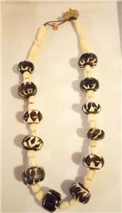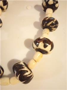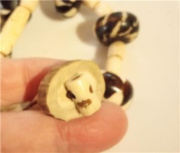 This necklace has a lot going on. There are whole tagua nuts that are cored, the core replaced so they can be strung, carved tube shaped tagua nut beads, smaller beads that look like ivory and the wonderful closure that shows the natural core of the nut and displays how the nuts look with the coating peeled away, undyed and as they are in nature. The closure involves a loop in the cord that the sliced nut slips into. 23-24" long. This is a statement piece.