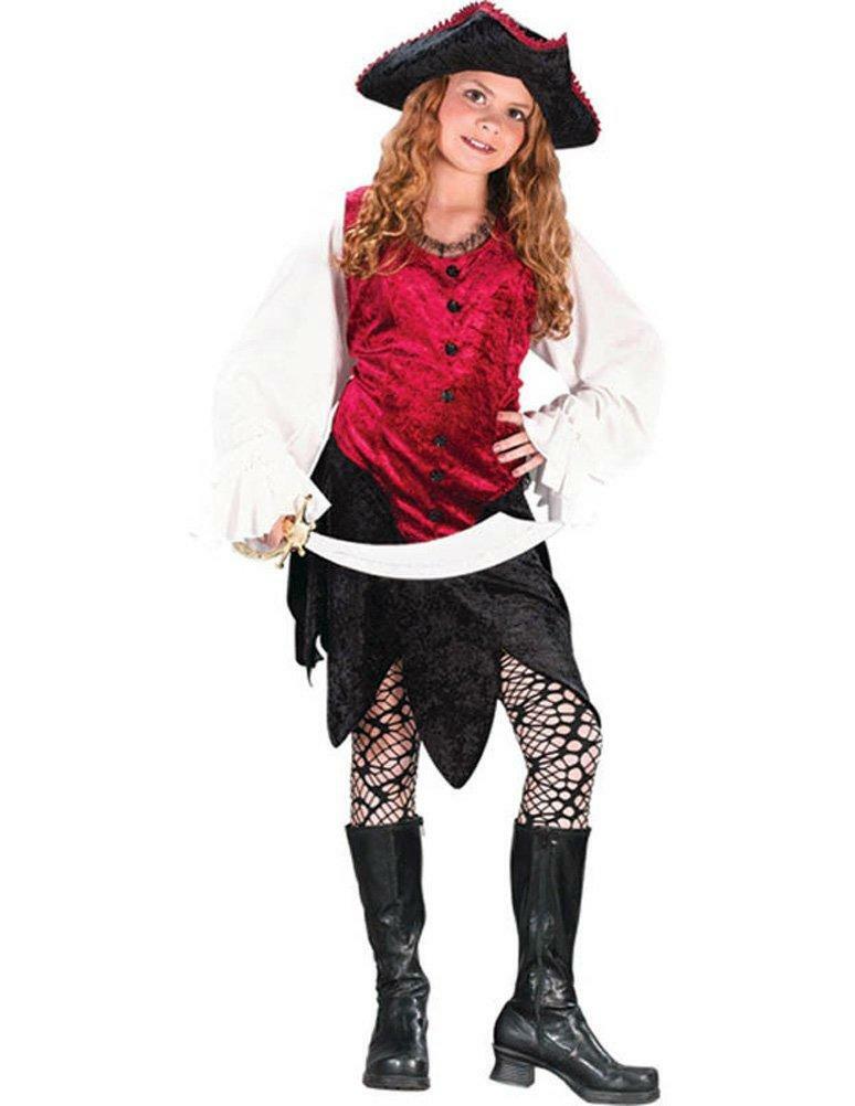 Arrrhh you ready to spend your Halloween searching for sweet treasures? The Girls First Mate Costume Includes: Dress with pirate sleeves, vest front, and pointed skirt. Great costume for plundering ships or for that Halloween party. Size child small.