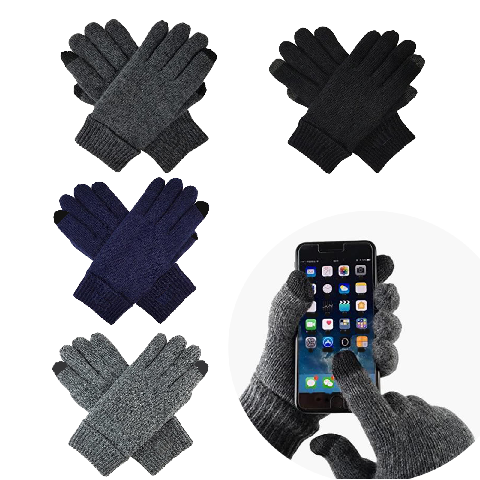 Material: Acrylic Fibers Department: Mens Color: Dark Grey, Blue, Grey, Black Applicable season: Winter Feature: This new soft gloves with smart touch technology allow you to operate touchscreen devices.It is a thicker version that keeps you warm. Compatible with all capacitive touch screen devices including phones, cameras, multimedia devices, game systems, depth finders, bike computers. For example: iPhone, Droid X, Tom-Tom GPS system,MP3 player, and so on. After washing can also touch screen, so do not worry about washing problems. Notes: Please allow little color difference due to different camera or light environment. Package Include: 1/2 Pairs Gloves Description