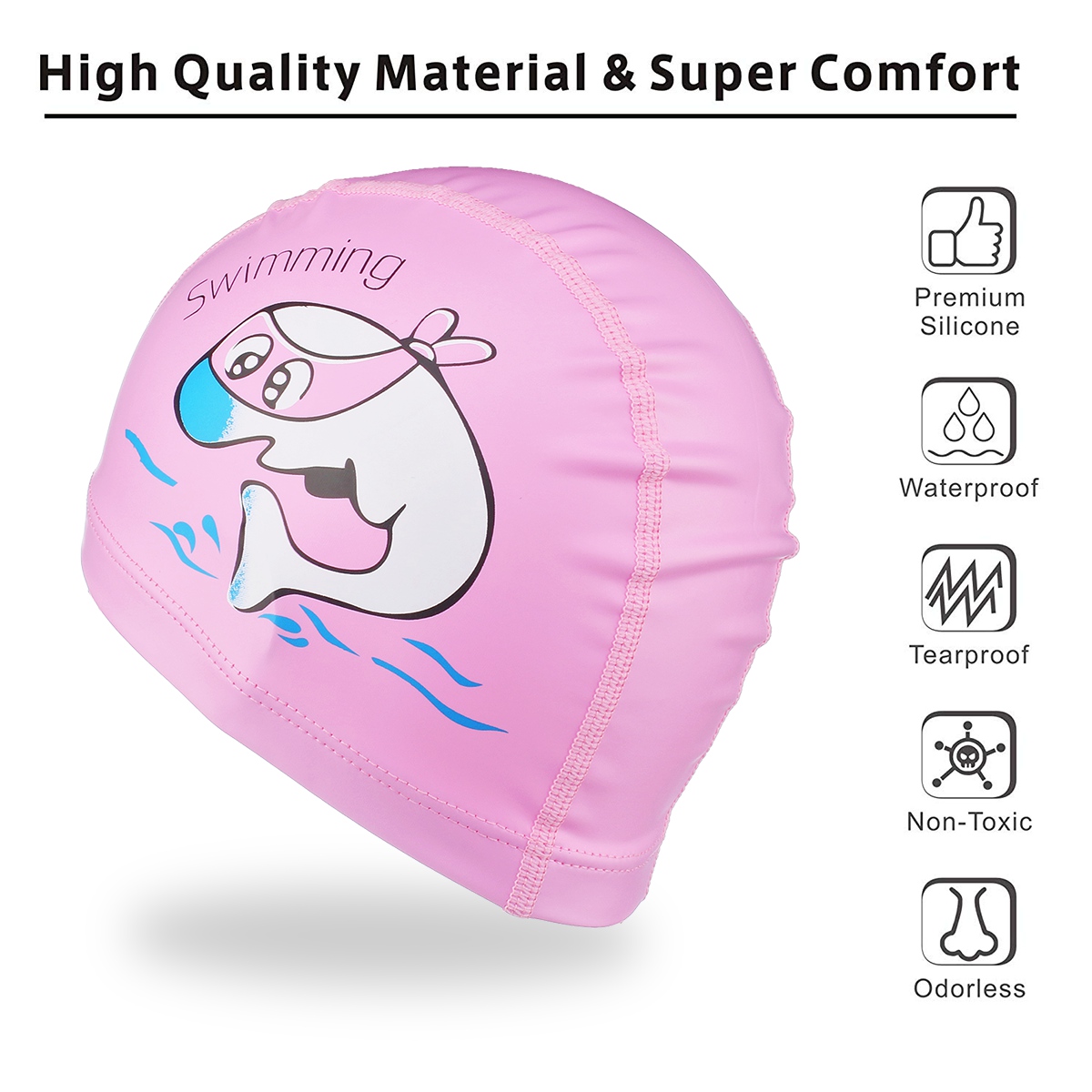 - ONE SIZE FITS ALL: Our swim cap is suitable for kids, boys, girls etc, because of its unique 3D ergonomic silicone design. The cap fits well, and is easy to keep the water out. It can prevent hair damage from the chlorine and has UV protection without odor and toxicity.