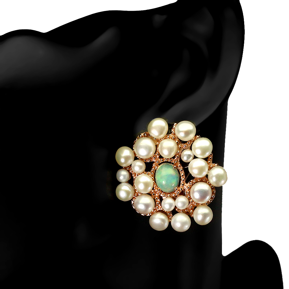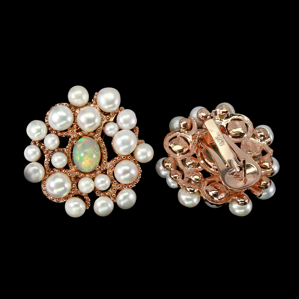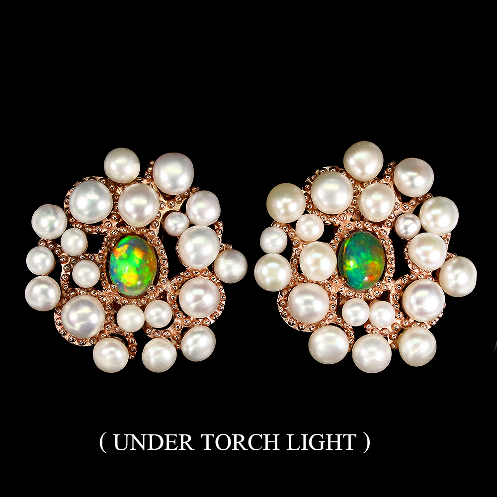 Unheated Oval Fire Opal Rainbow Full Flash Pearl 925 Sterling Silver Earrings