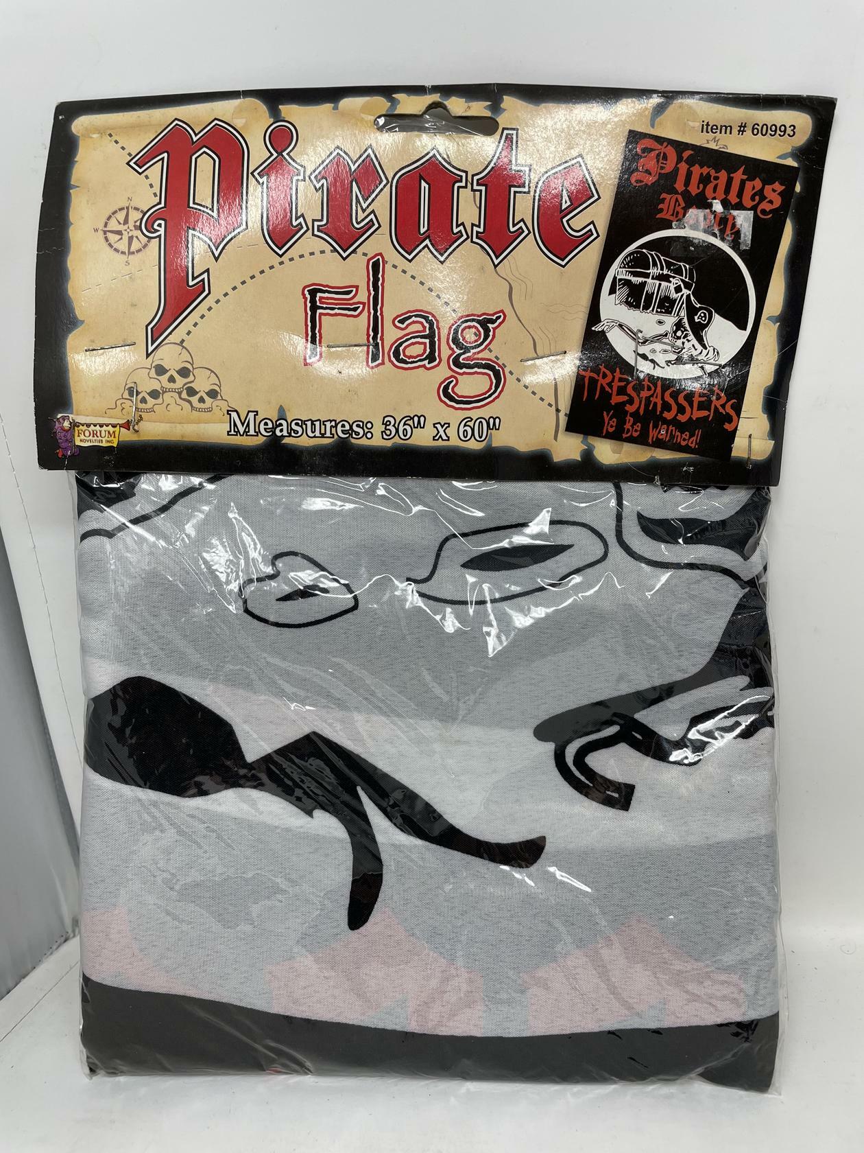 Trespassers Ye Be Warned! This 36 x 60 pirate flag is perfect to complete your look for your next pirate themed party! This is a black flag with red lettering and a white picture of a pirate and his treasure chest. The pharse "Pirates Booty" and "Trespassers Ye Be Warned" are in bold red letters.