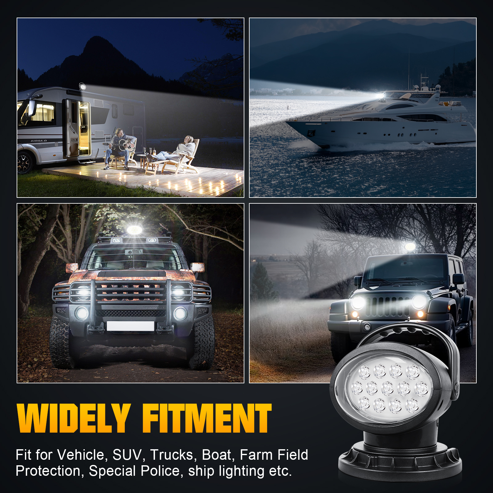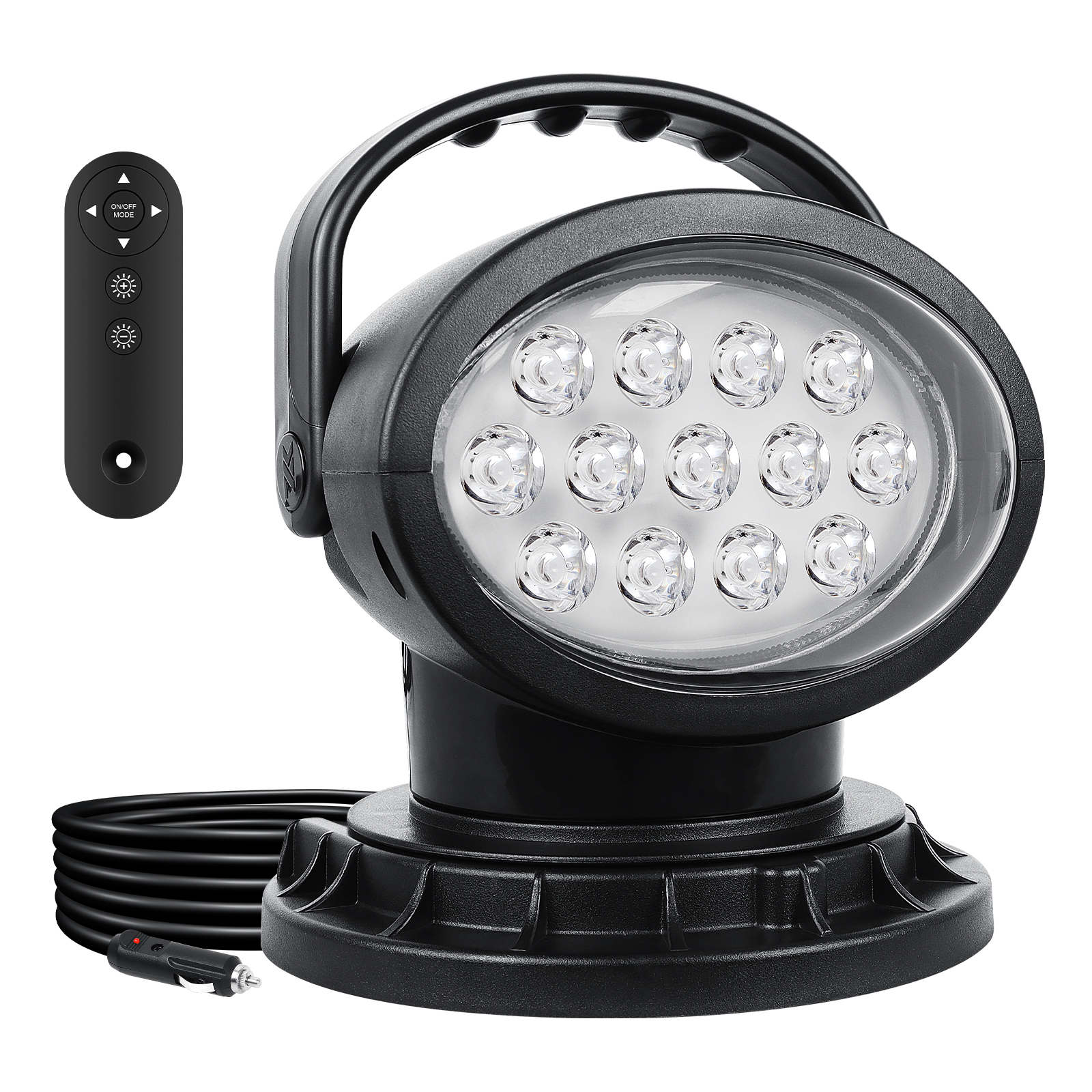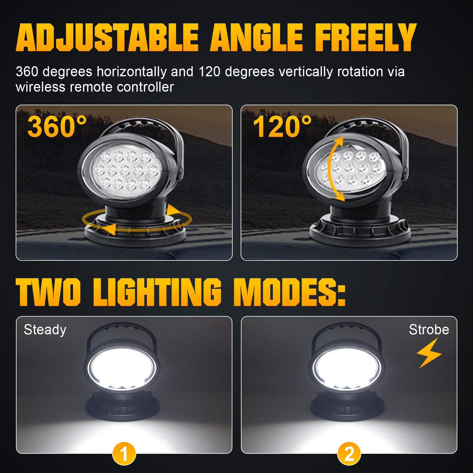 【Fearture】: Rotate angle of 360° Left-Right and 120° Up-Down, to provide you with multiangle perspective. This spotlight comes with a wireless remote control so you can turn the light on and off as well as rotate it. And with cigarette lighter socket, easy to use.