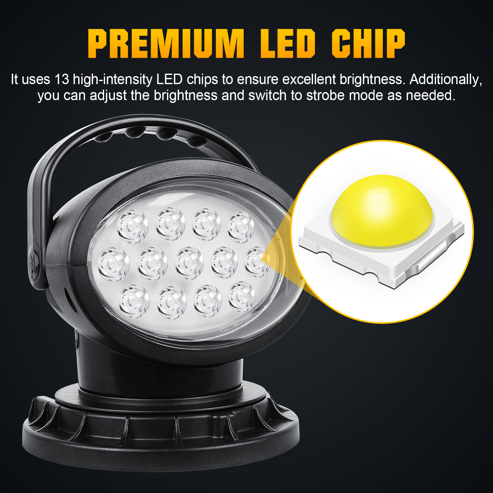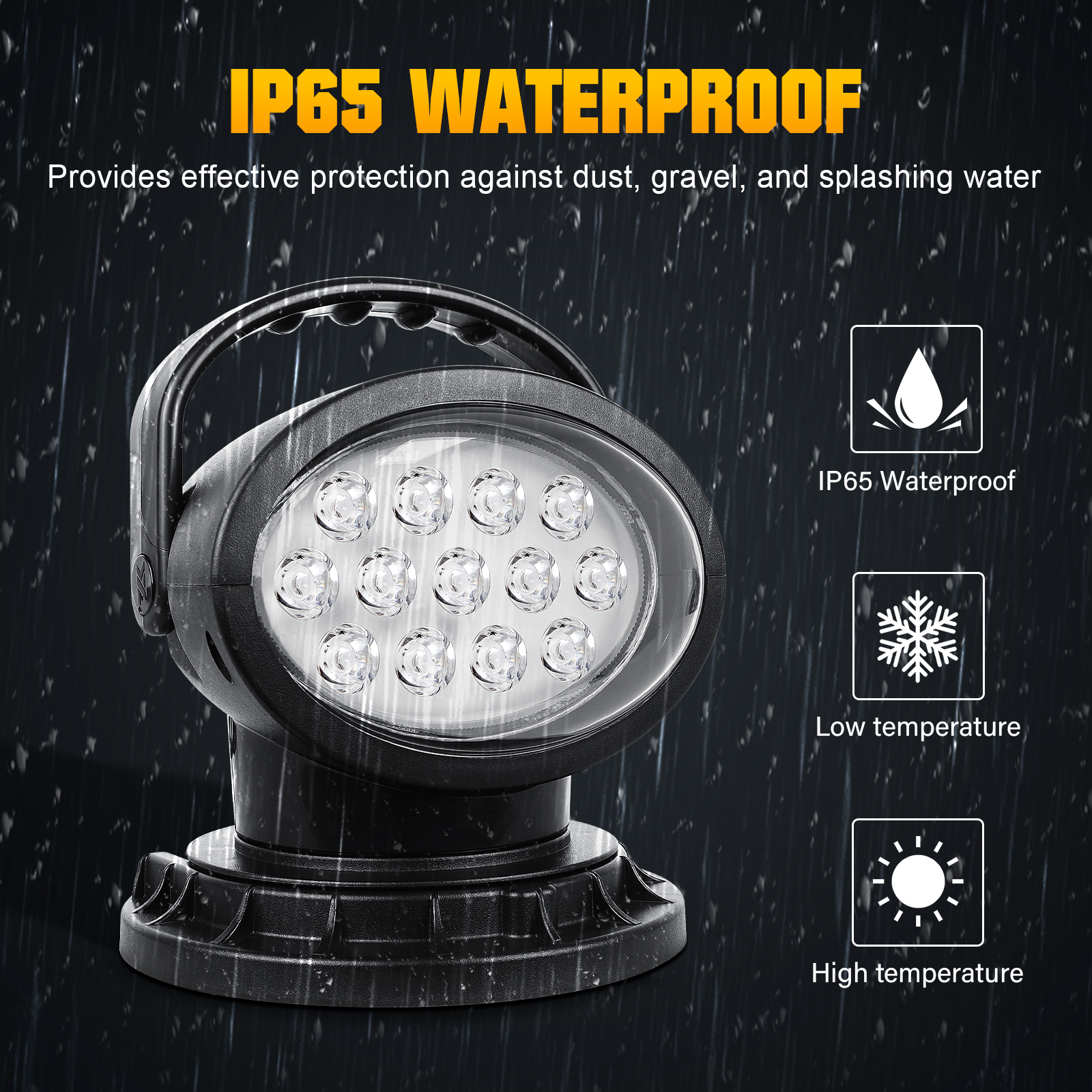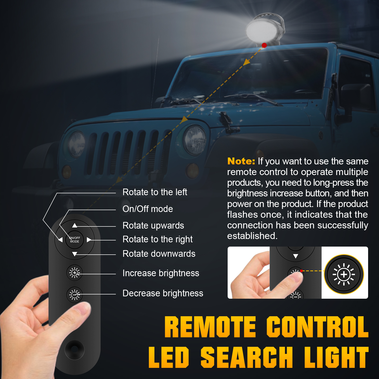 【Fearture】: Rotate angle of 360° Left-Right and 120° Up-Down, to provide you with multiangle perspective. This spotlight comes with a wireless remote control so you can turn the light on and off as well as rotate it. And with cigarette lighter socket, easy to use.