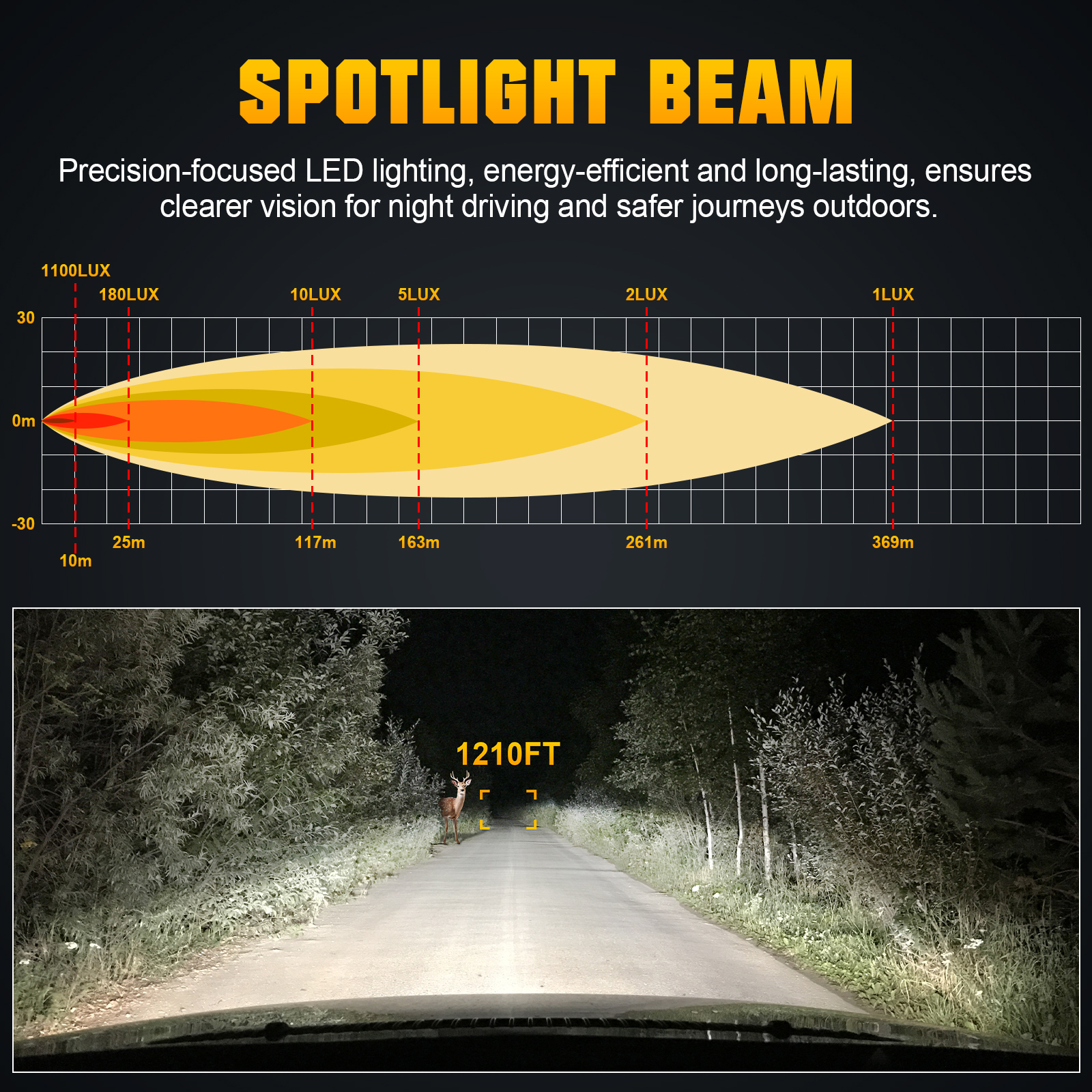 【Good Performance】: This offroad light bar is made of die-cast aluminum, the thin heat sink fins ensure efficient heat dissipation. And equipped with shockproof and shatterproof PC lenses that can focus the light well and ensure high brightness illumination. IP67 waterproof standard.