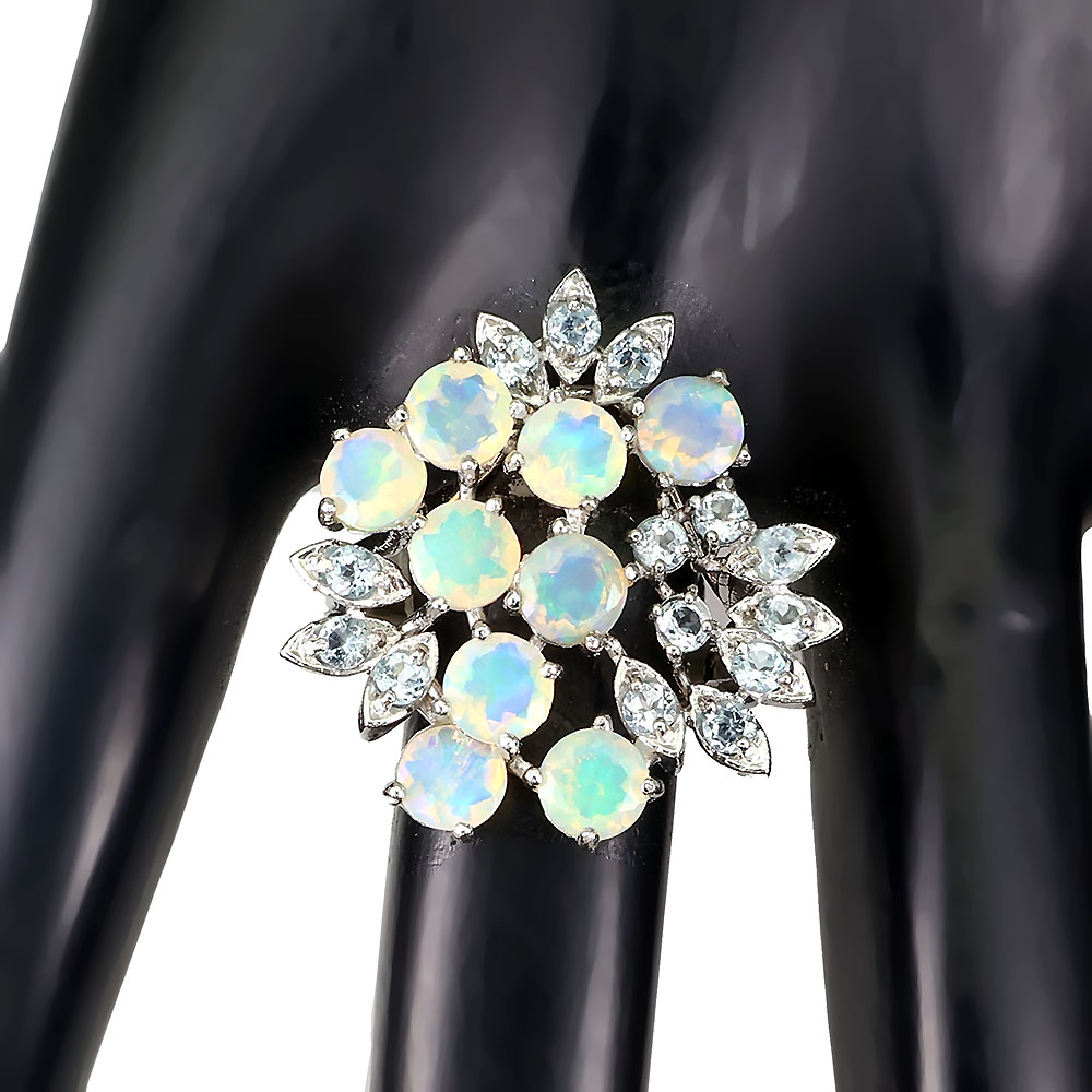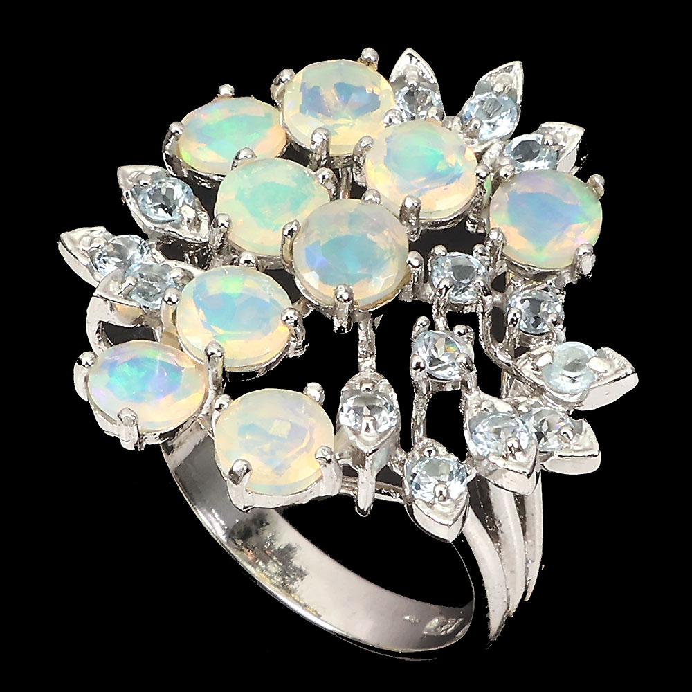 Unheated Round Fire Opal Rainbow 5mm Aquamarine 925 Sterling Silver Ring Sz 9.5