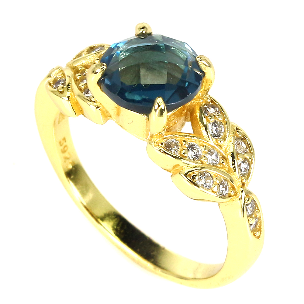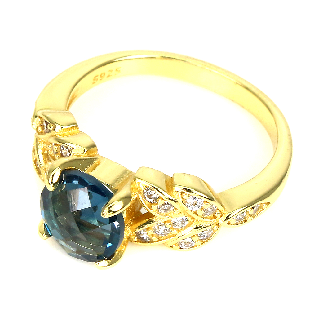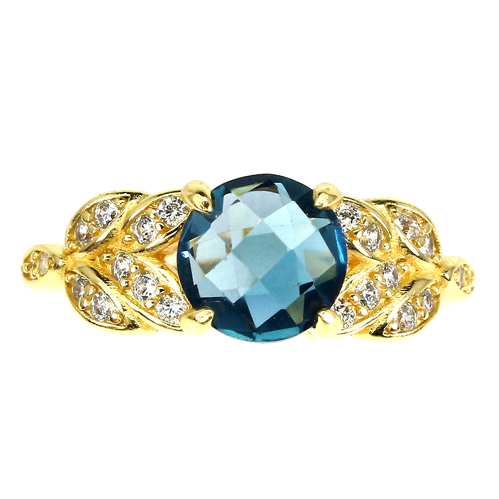 Round London Blue Topaz 8mm Cz 14K Yellow Gold Plate 925 Sterling Silver Ring 8