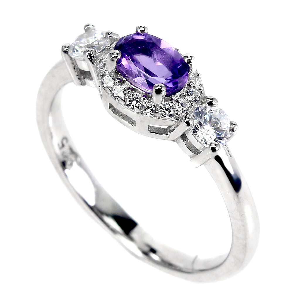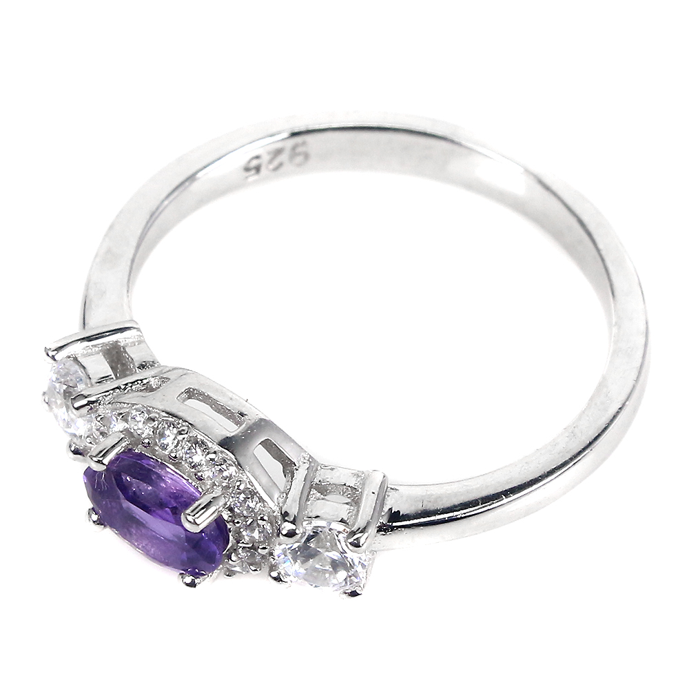 Unheated Oval Amethyst 6x4mm Cz 14K White Gold Plate 925 Sterling Silver Ring