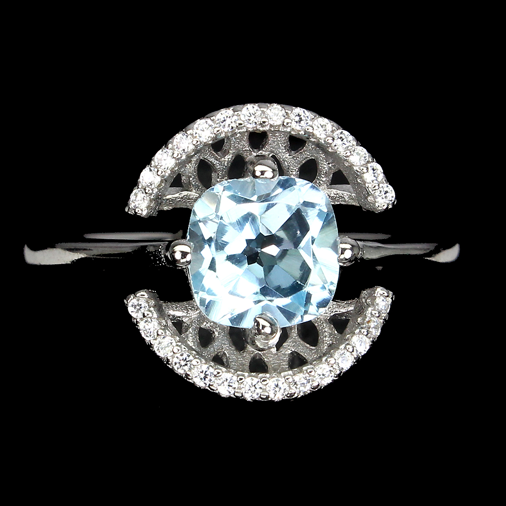 Cushion Sky Blue Topaz 7mm Cz 14K White Gold Plate 925 Sterling Silver Ring