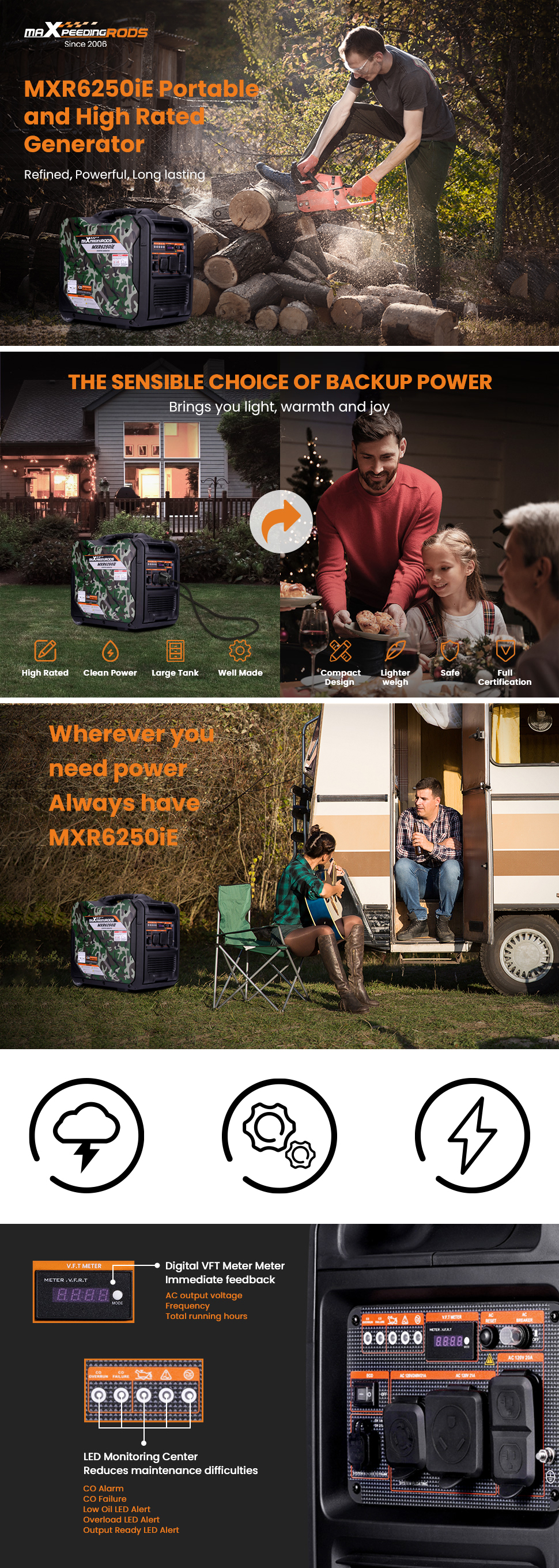 [Multi-Purpose Power Supply]Rated power 5000W, maximum power 5500W, basically can meet the larger power appliances (such as conventional power tool). Under power outage scenarios, it can basically provide continuous power supply for small and medium-sized households [Easy Start] Recoil Start and Eletric Start are configured in two starting modes, electric start is easy to operate and can be started successfully at once. recoil start can be used as an alternative starting method to recharge the built-in battery for electric start when it runs out of power. [Clear Digital Display]The panel is equipped with a digital display screen to monitor the data and feedback information in real time. It helps you clearly understand the fuel condition, usage, power generation status and generator condition. [Power More Appliances]With 2*120V 20A, 1*120V 30A, 1*120V/240V 30A dual voltage plug (can be directly connected to 220V and 240V appliances), 2*USB port to solve the output needs of conventional appliances. Large panel with many interfaces, can supply power to a larger number of appliances simultaneously without transfer switch [Compact Design]Makes it lighter weight in the 5KW and higher power band, and 25% weight reduction on the basis of the previous generation MXR5500, with a net weight of only 86lbs, a significant increase in portability. The longest side is 21.7 inches, making it smaller and more convenient to store when not in use. [Brand Warranty]Maxpeedingrods warrants all the inverter generators against defects in workmanship under normal use for a period of 2 years from the date of retail purchase by the original end-user purchaser ("Warranty Period"), and free lifetime technical support and customer service.