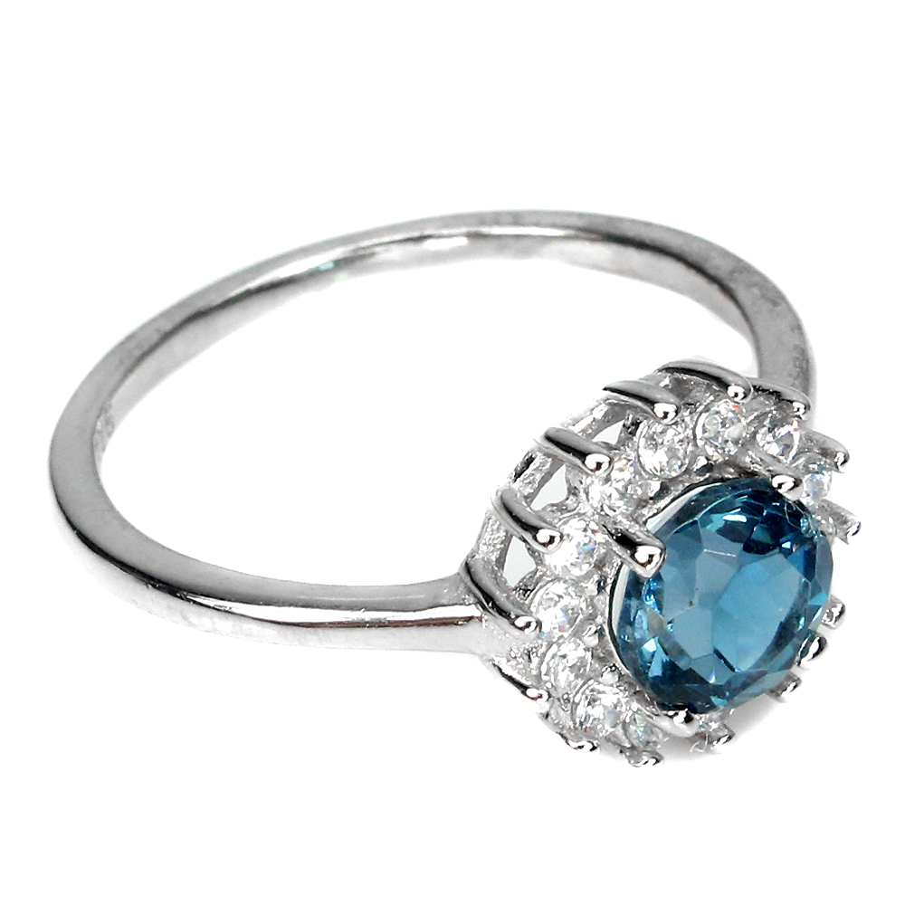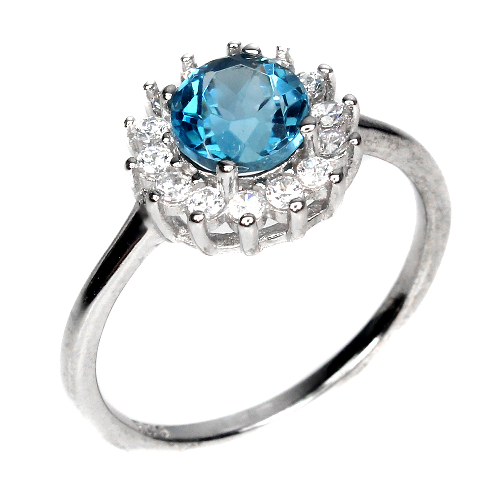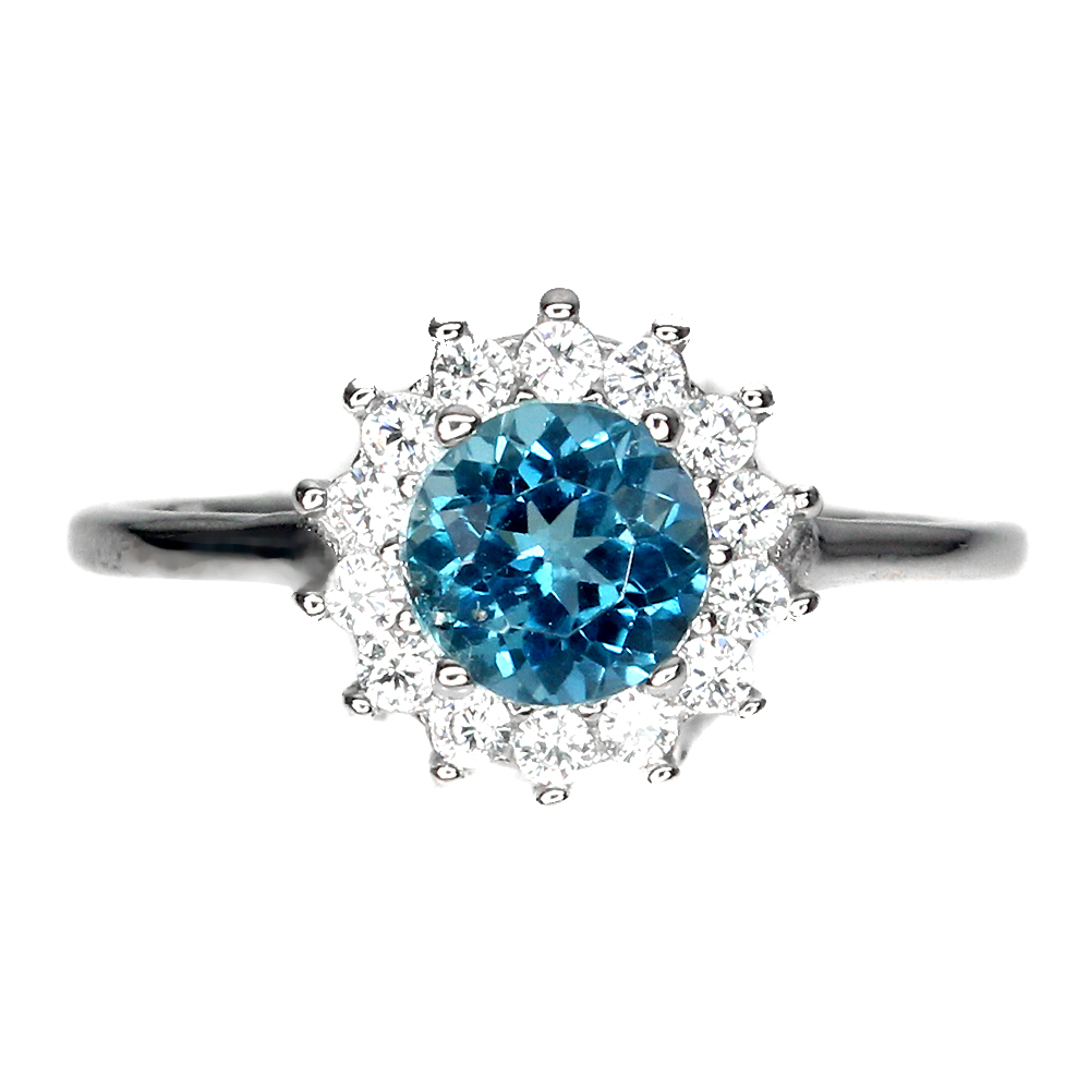 Round London Blue Topaz 6mm Cz 14K White Gold Plate 925 Sterling Silver Ring 9.5