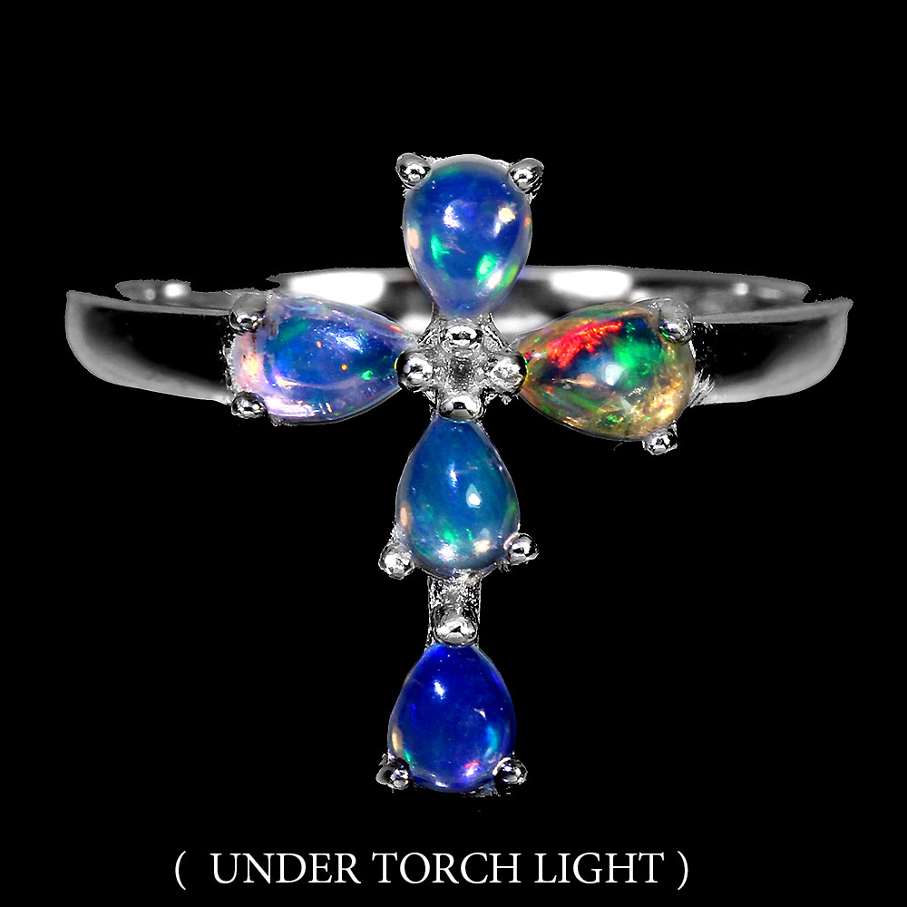 Unheated Pear Fire Opal Rainbow Full Flash 5x3mm 925 Sterling Silver Ring Size 6
