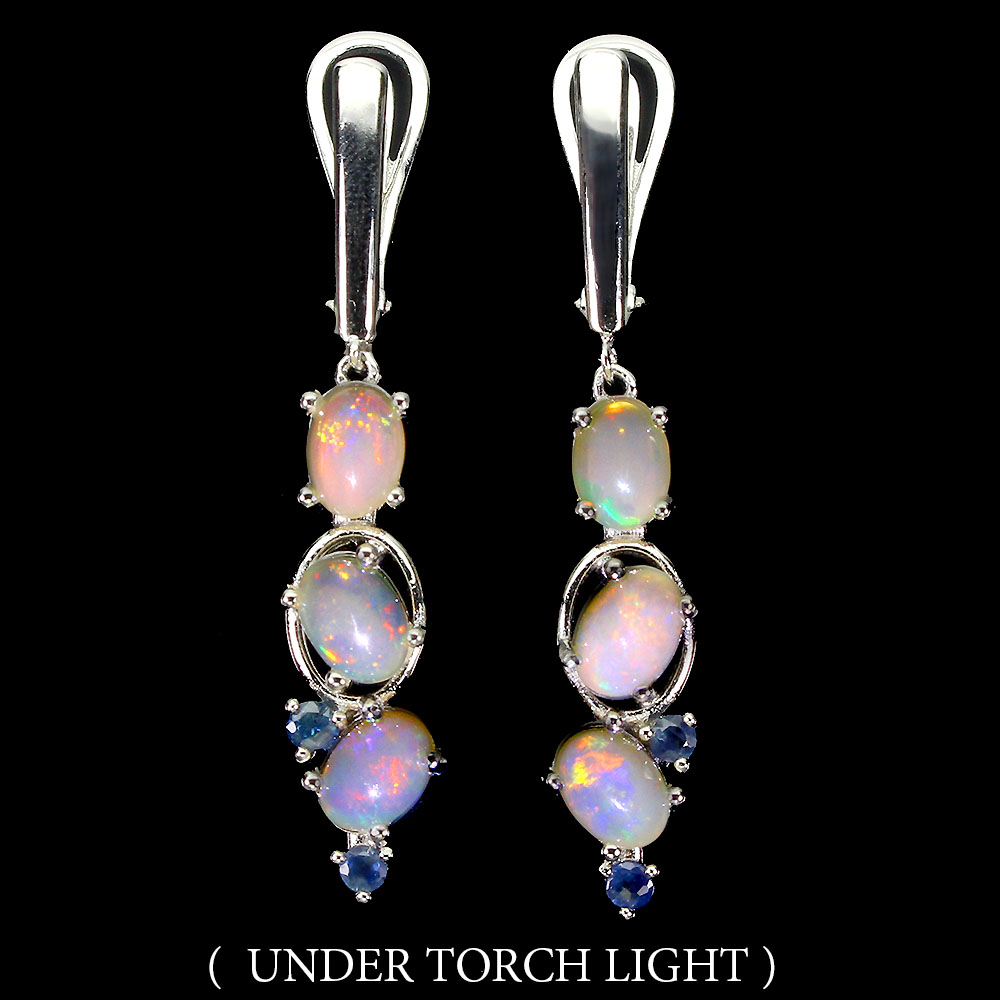 Unheated Oval Fire Opal Rainbow 7x5mm Blue Sapphire 925 Sterling Silver Earrings