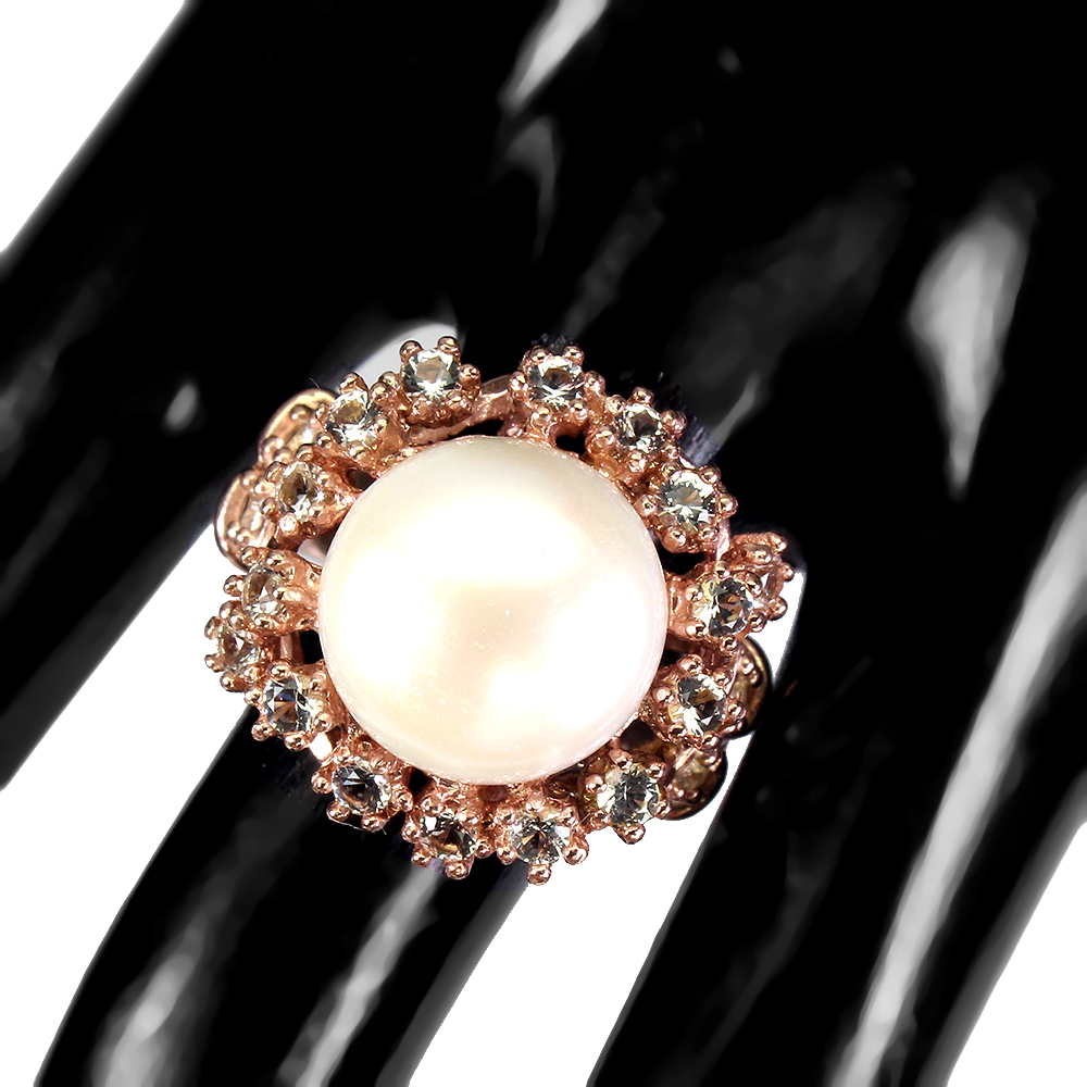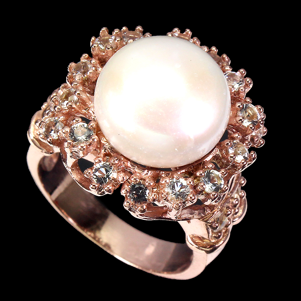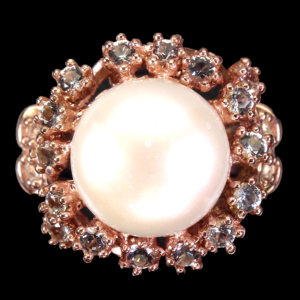 Round White Pearl 14mm White Cz 14K Rose Gold Plate 925 Sterling Silver Ring