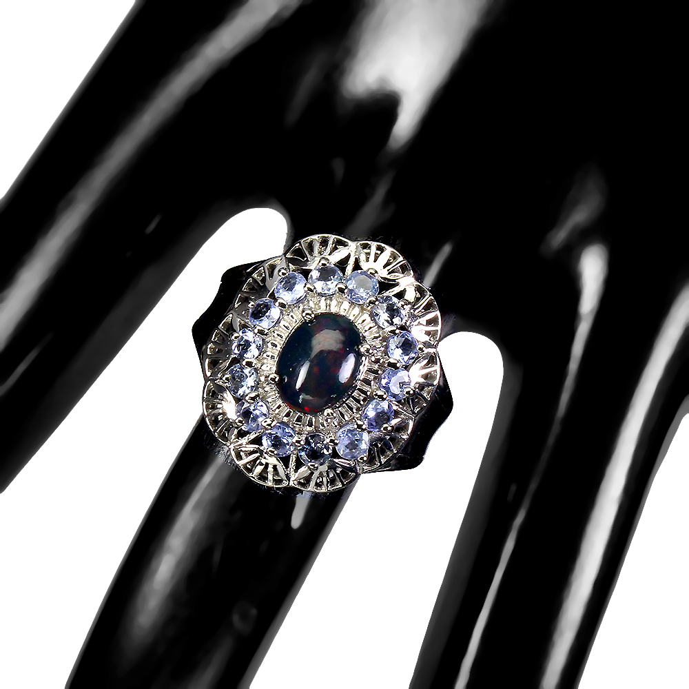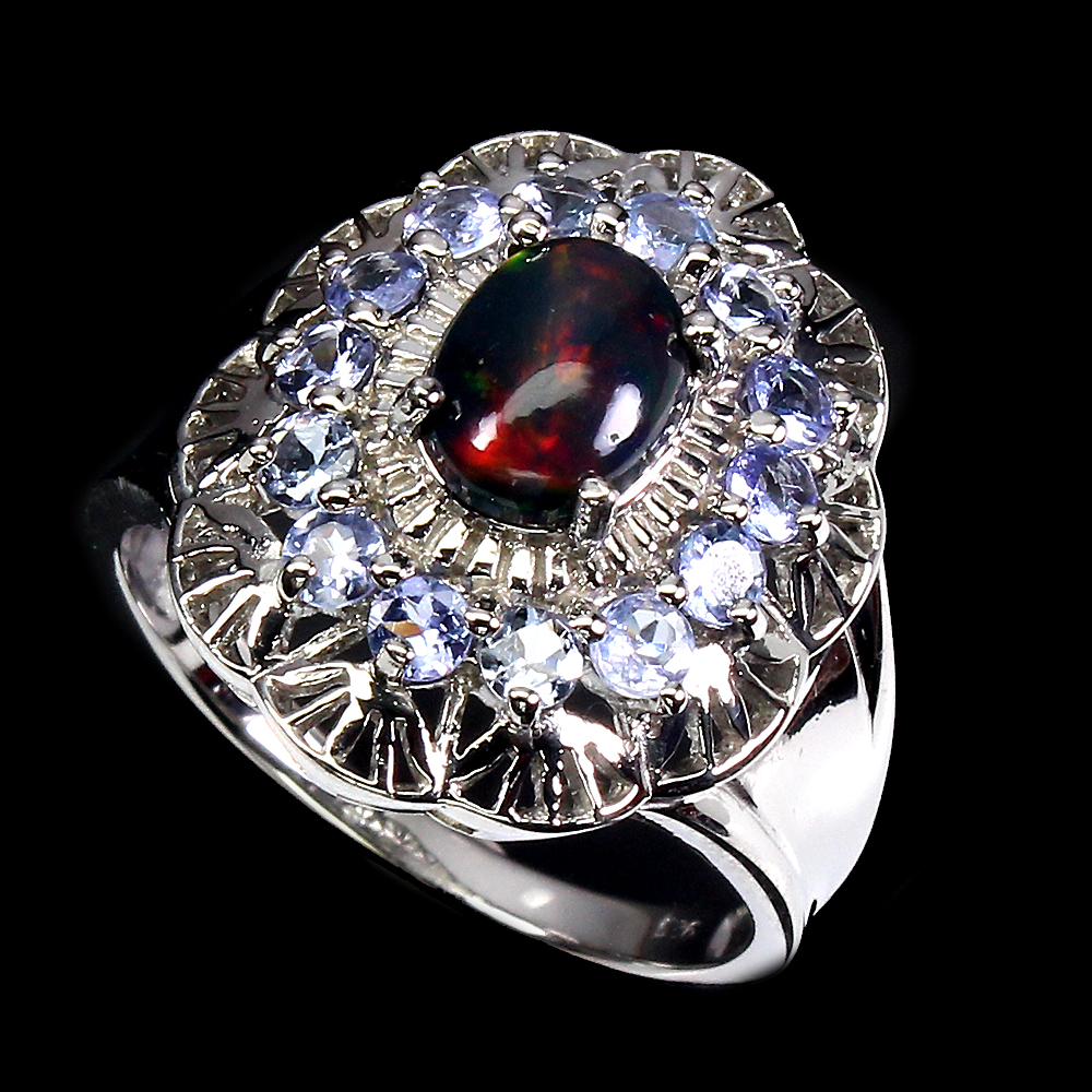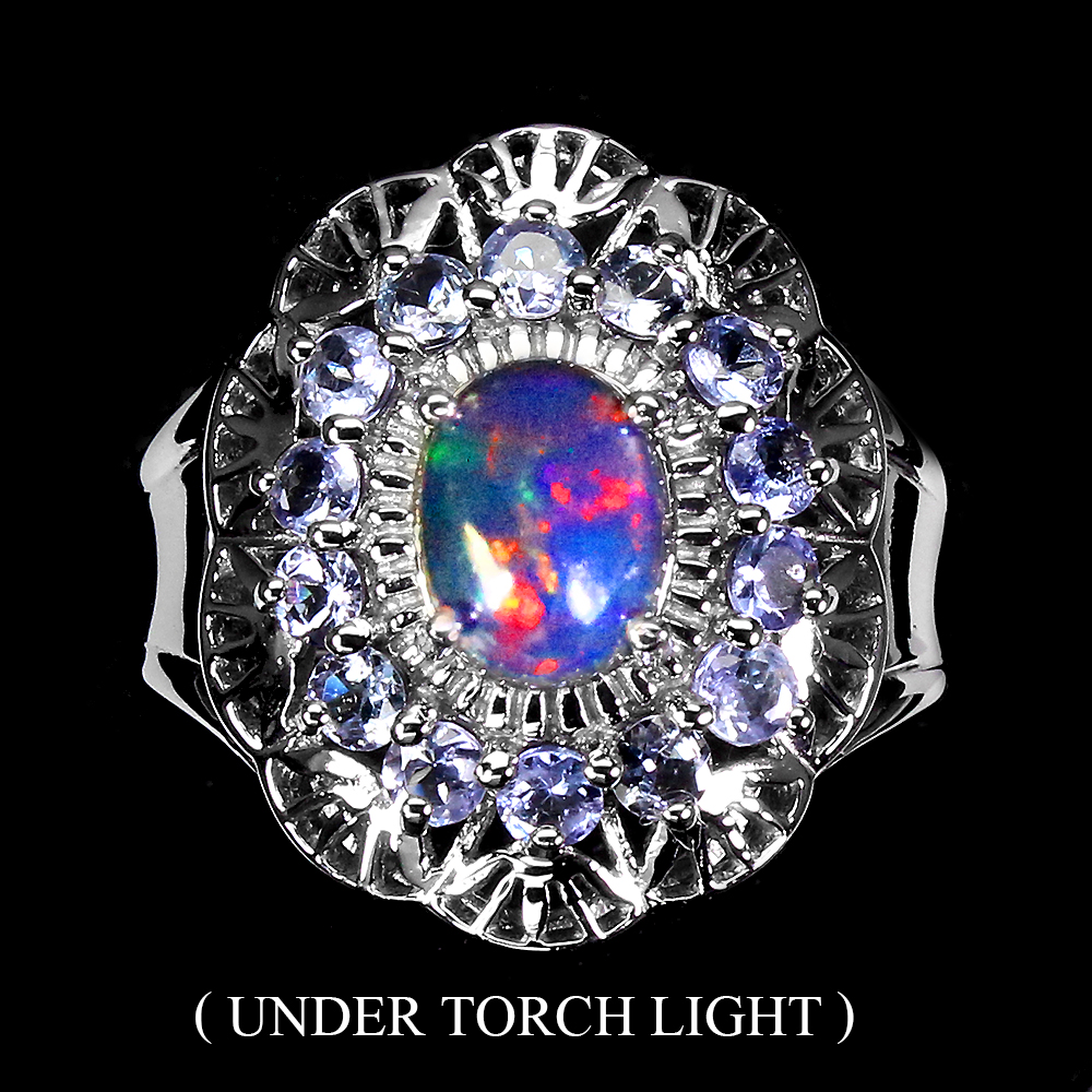 Oval Black Opal Rainbow Full Flash 8x6mm Tanzanite 925 Sterling Silver Ring 9