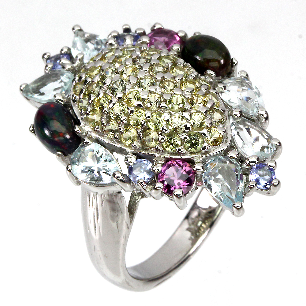 Unheated Pear Aquamarine Black Opal Tanzanite Gems 925 Sterling Silver Ring 9