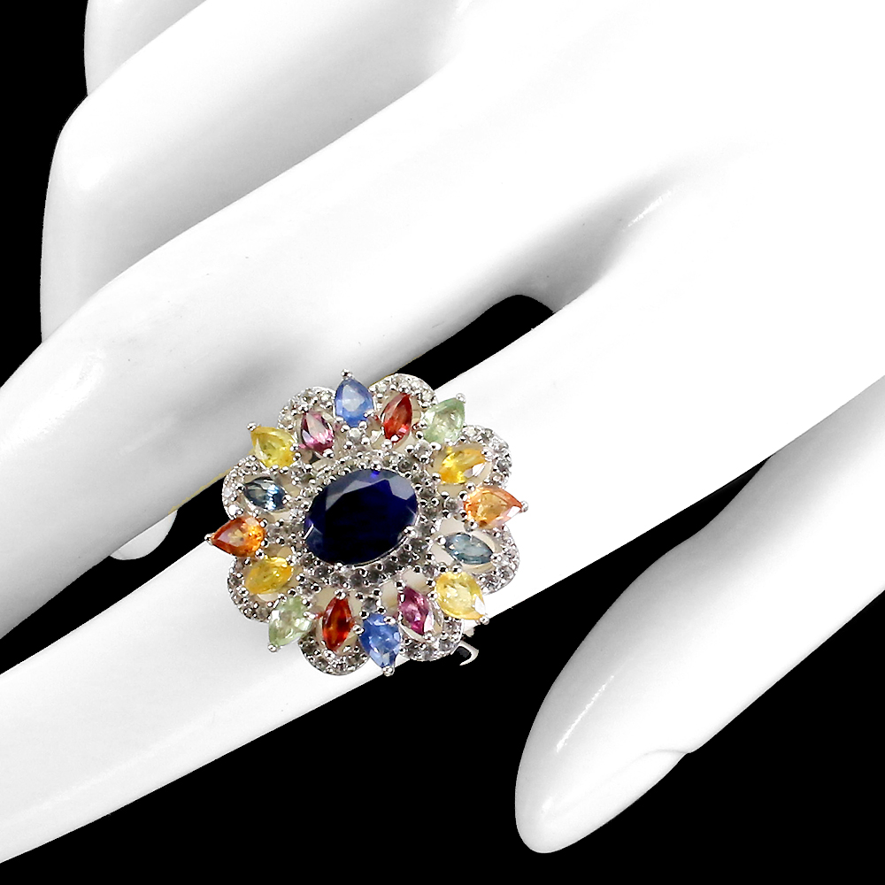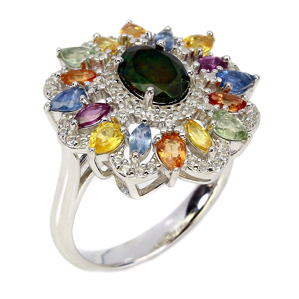 Oval Black Opal 8x6mm Sapphire White Topaz 925 Sterling Silver Ring Size 8