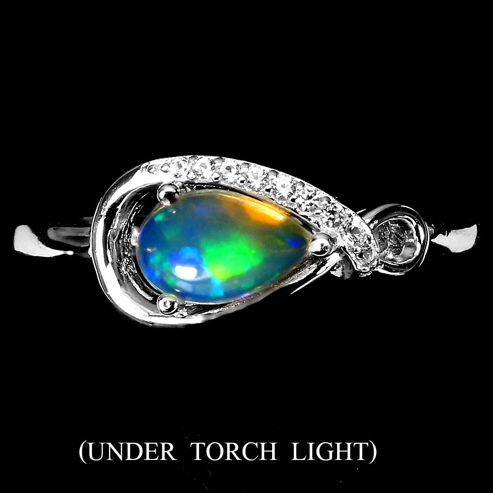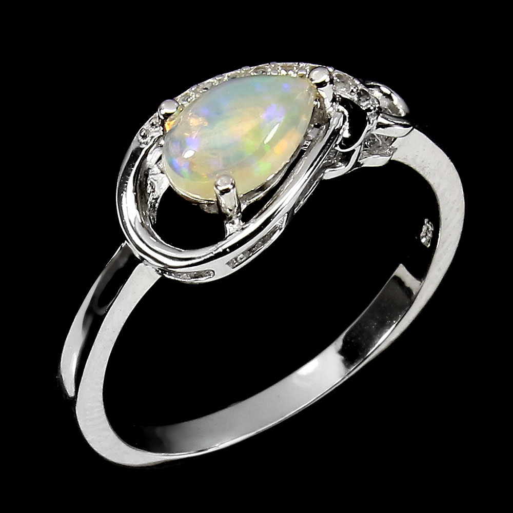 Unheated Pear Fire Opal Rainbow 8x5mm White Topaz 925 Sterling Silver Ring 7