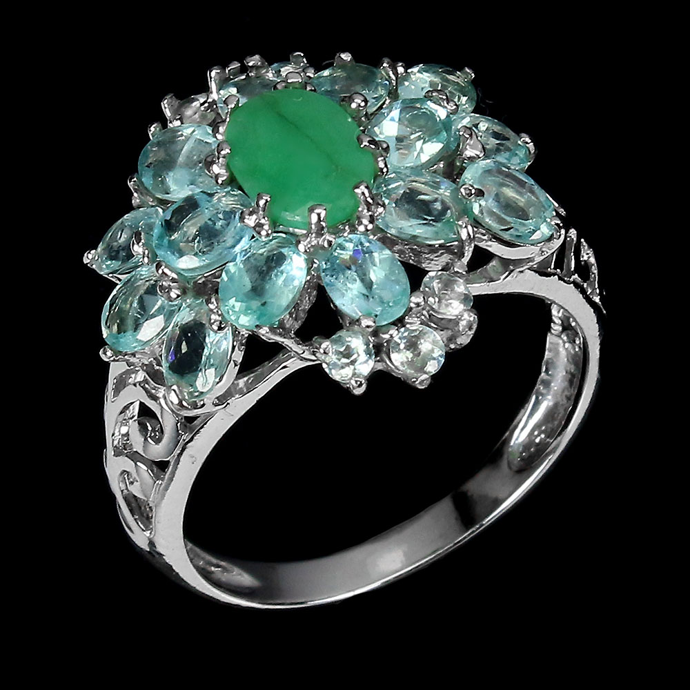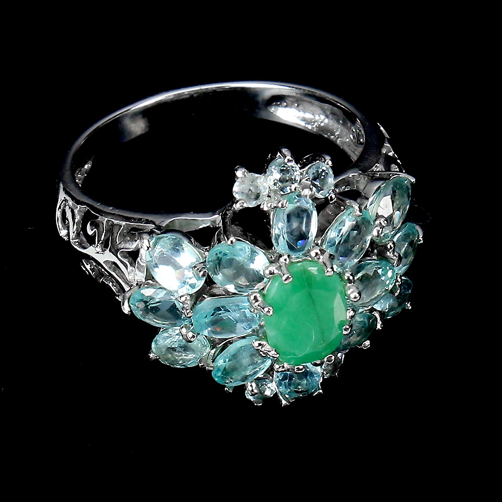 Unheated Oval Green Emerald 7x5mm Aquamarine Zircon 925 Sterling Silver Ring 7.5