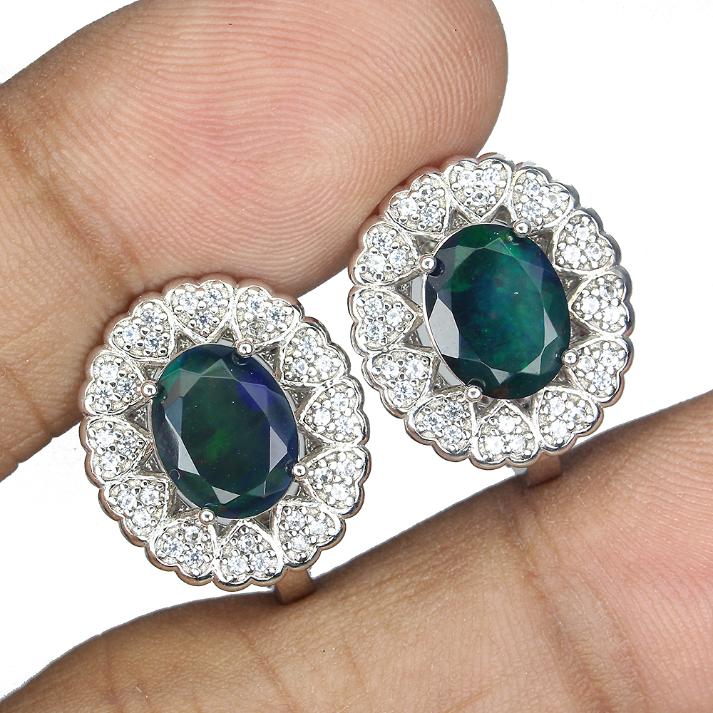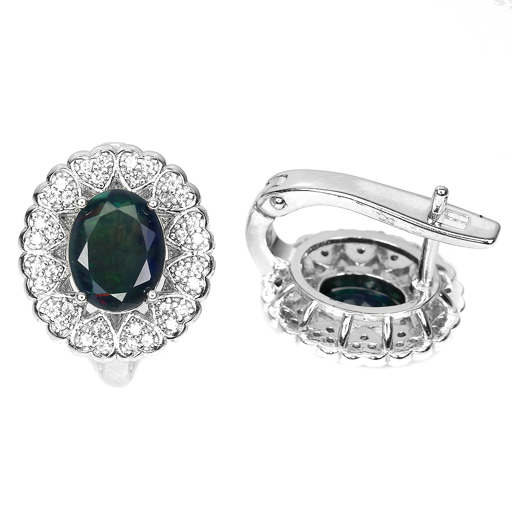 Clarity Enhanced Oval Black Opal 9x7mm White Topaz 925 Sterling Silver Earrings