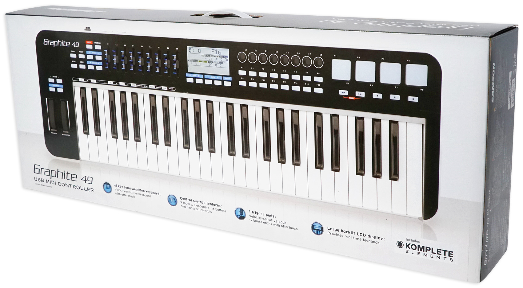 The Samson Graphite 49 USB MIDI Controller gives you all the performance and production control you need to get the most out of your music software. Combining an intuitive 49-key semi-weighted keyboard with a feature set that is both useful and accessible, the Graphite 49 is a sleek, powerful tool that allows you to express your most dynamic musical ideas.