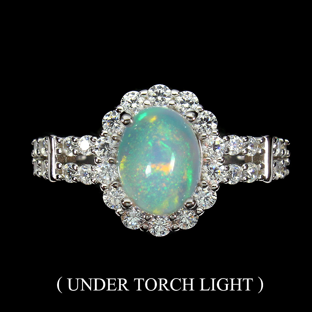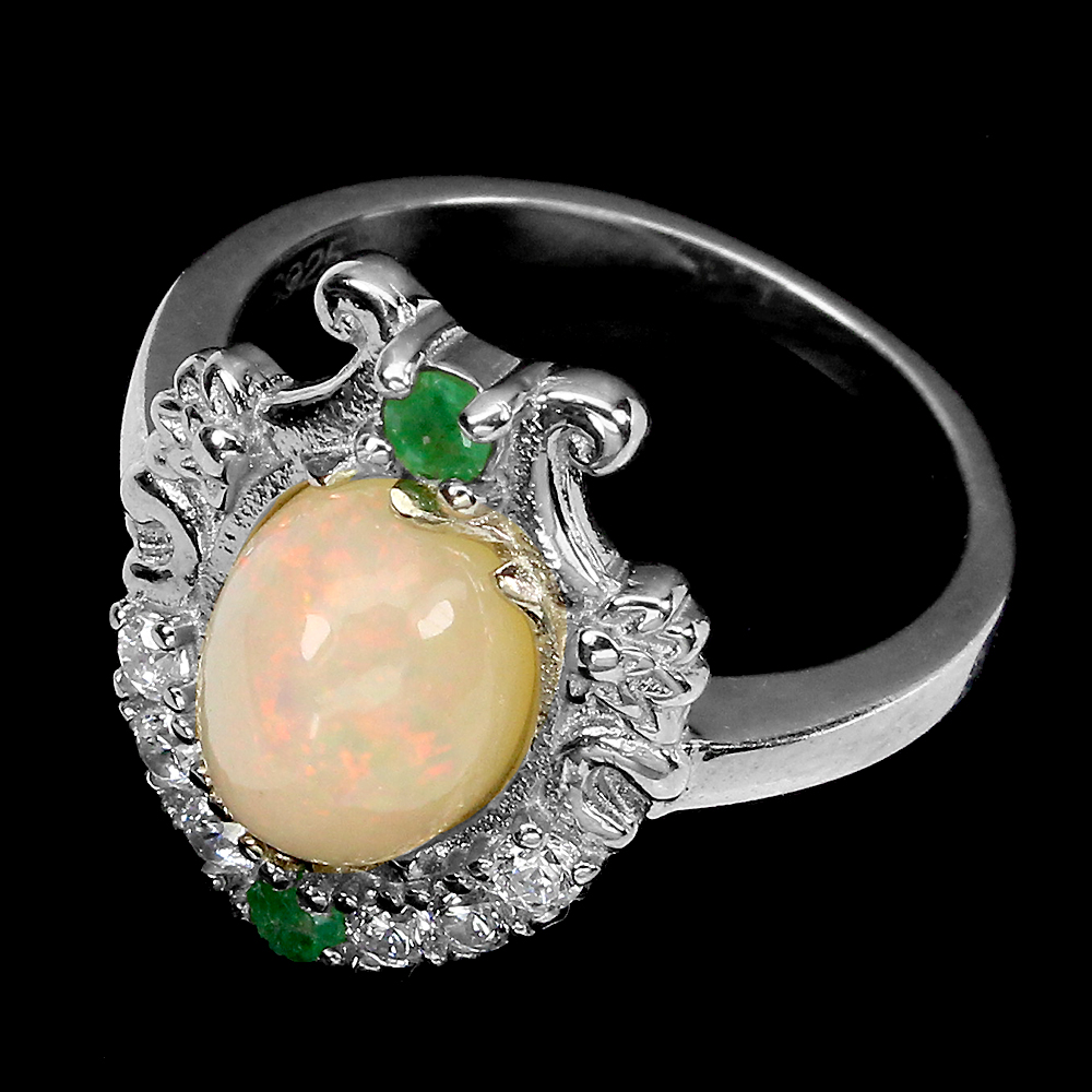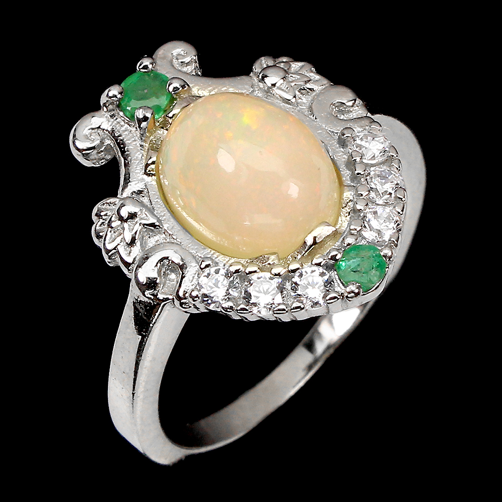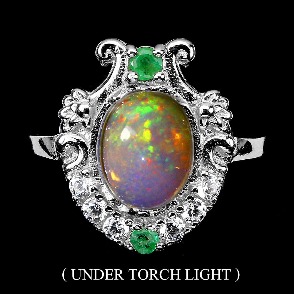 Unheated Oval Fire Opal Rainbow 9x7mm Green Emerald Cz 925 Sterling Silver Ring