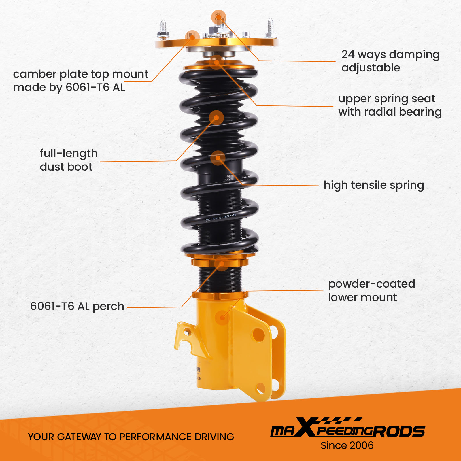1. Lowered height adjustment from 25-75mm (depends on vehicle models) which allows a lower center of gravity and also adds a more aggressive stance