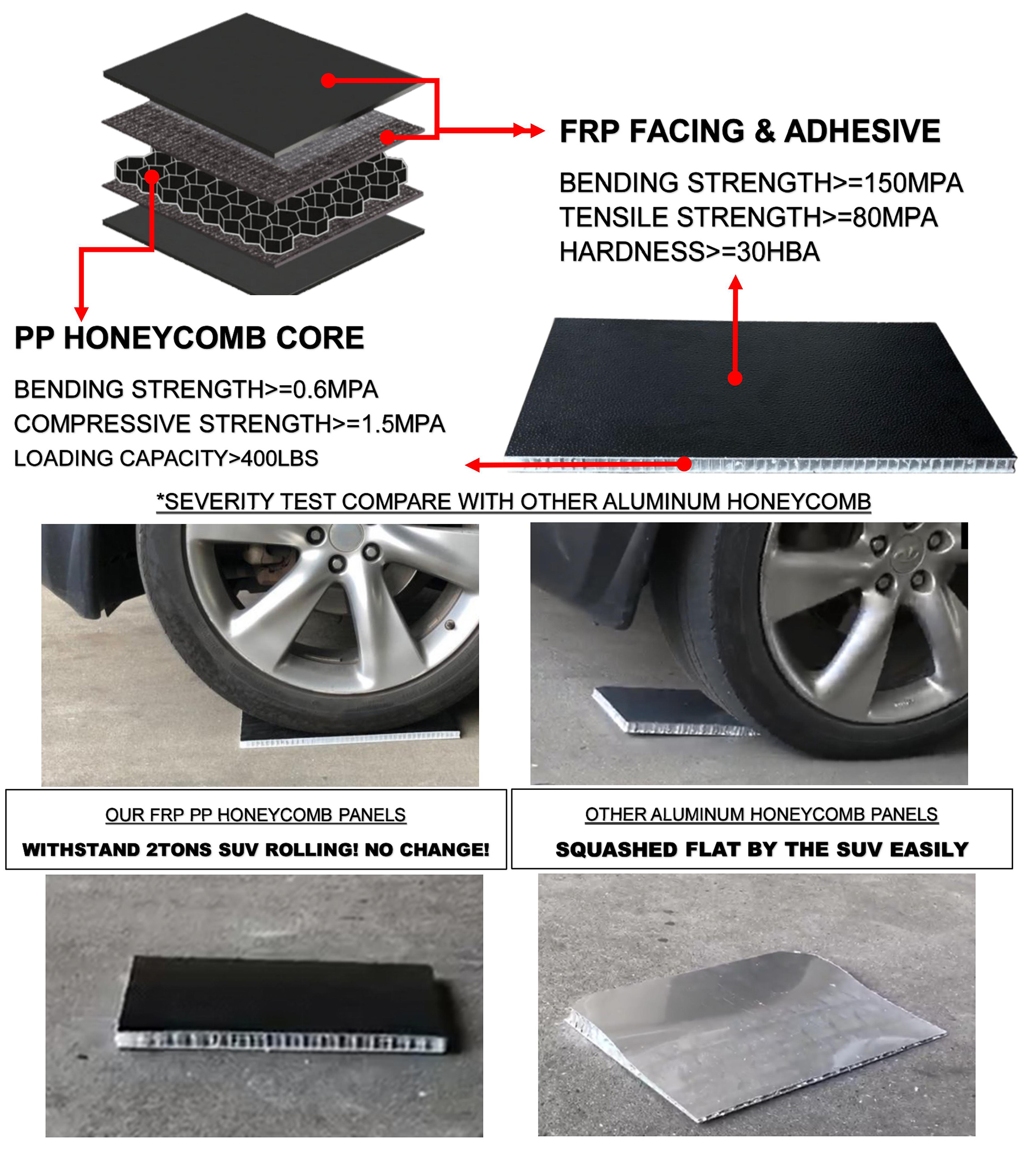 *Panel made of Fiberglass Reinforced Plastic with PP honycomb, This FRP material is Light weight, high-intensity,Anti-impact/vibration and more scratch resistant than aluminum alloy, and has higher compressive strength. excellent performance in water proof/Anti-moisture,strong resistance to chemicals /corrosion,easy to clean the surface.Sound isolation,Energy and heating absorption.